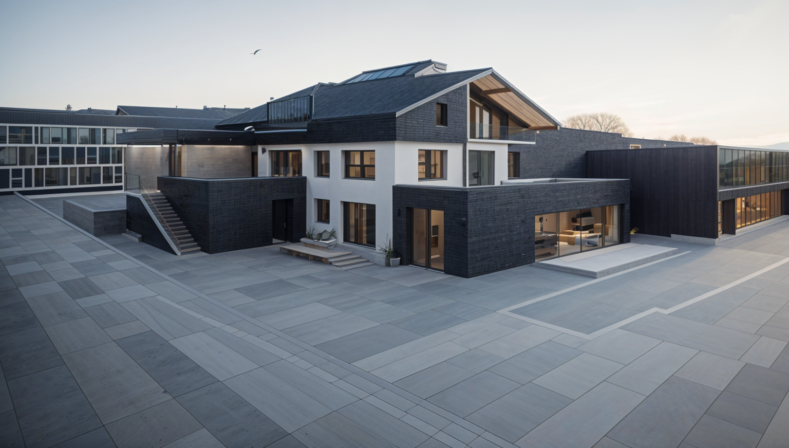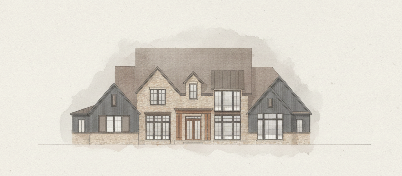 remove red color around windows add clouds to sky this facade should be lit by sunlight render style should be watercolor rendering with sketched outlines remove scale figure on the left by the stairs