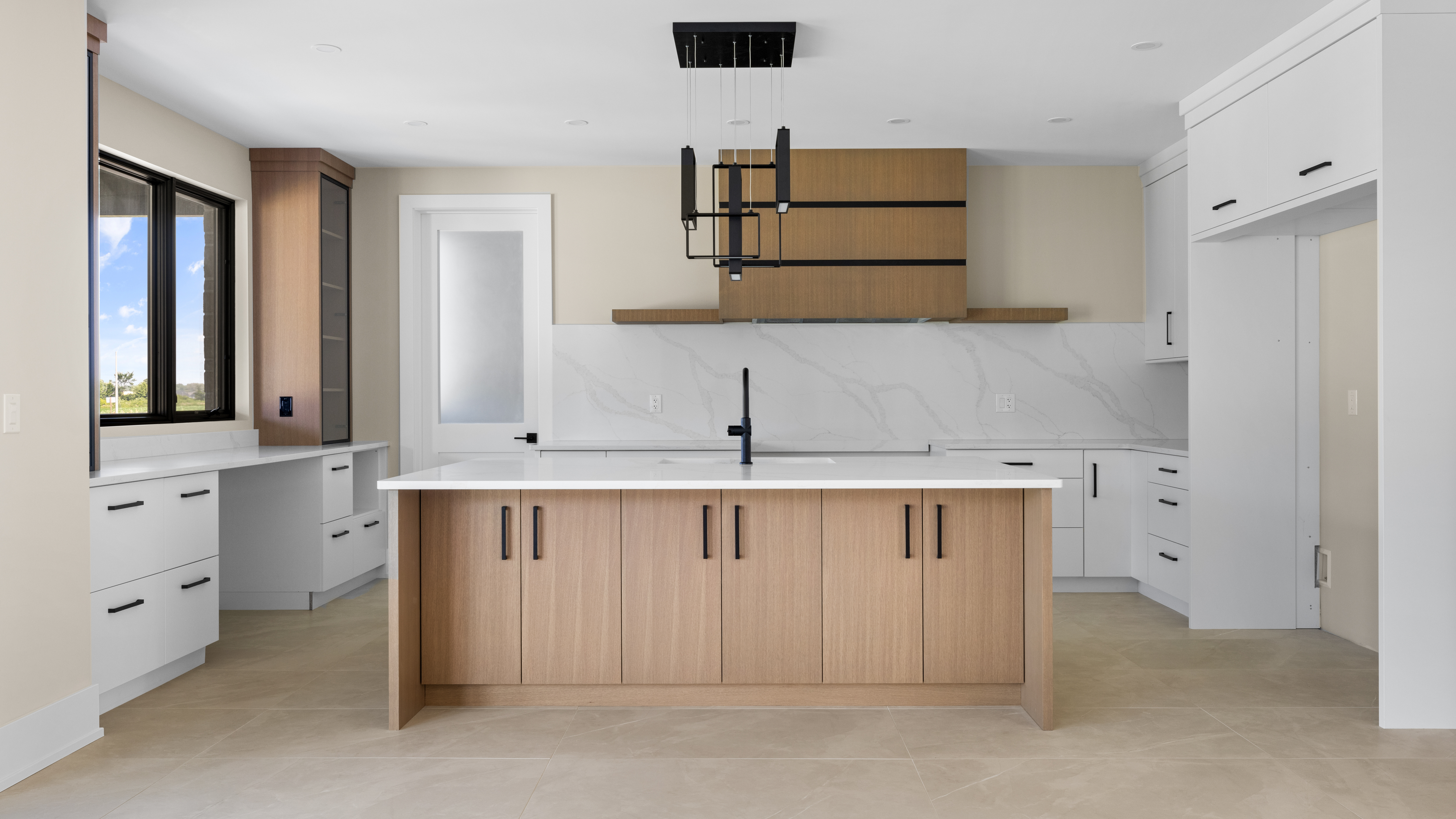 luxury fridge on the right add coastal bar stools add a wolf range under the hoodvent and some modern scandifornia decor on the counters