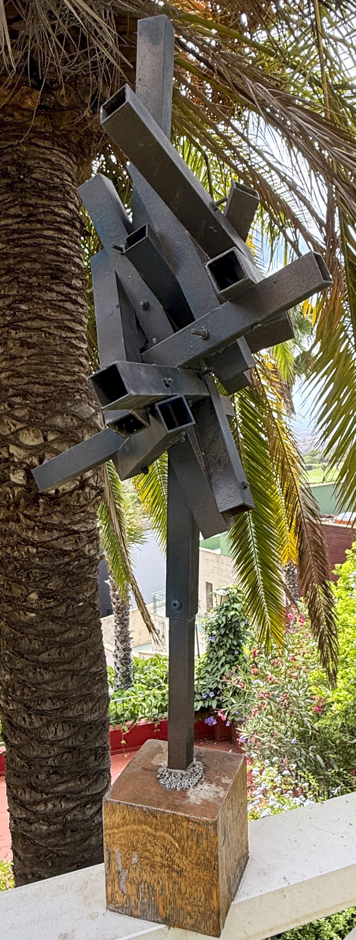 place the sculpture on a pedestal of solid transparent glass prism and a plaque that says black is black 2026 luis s nchez on a seafront promenade with people strolling and a garden with flowers and grass around the statue