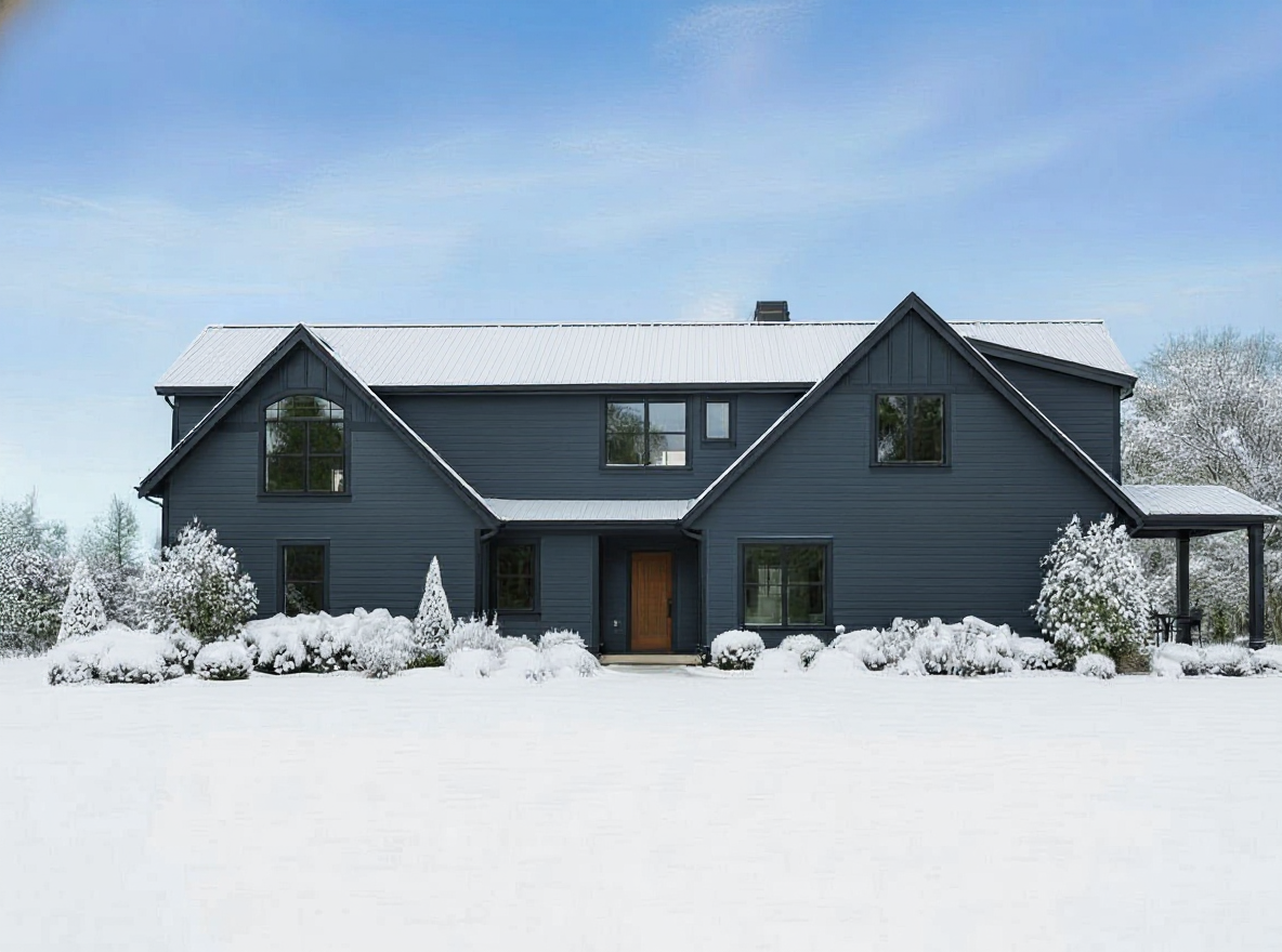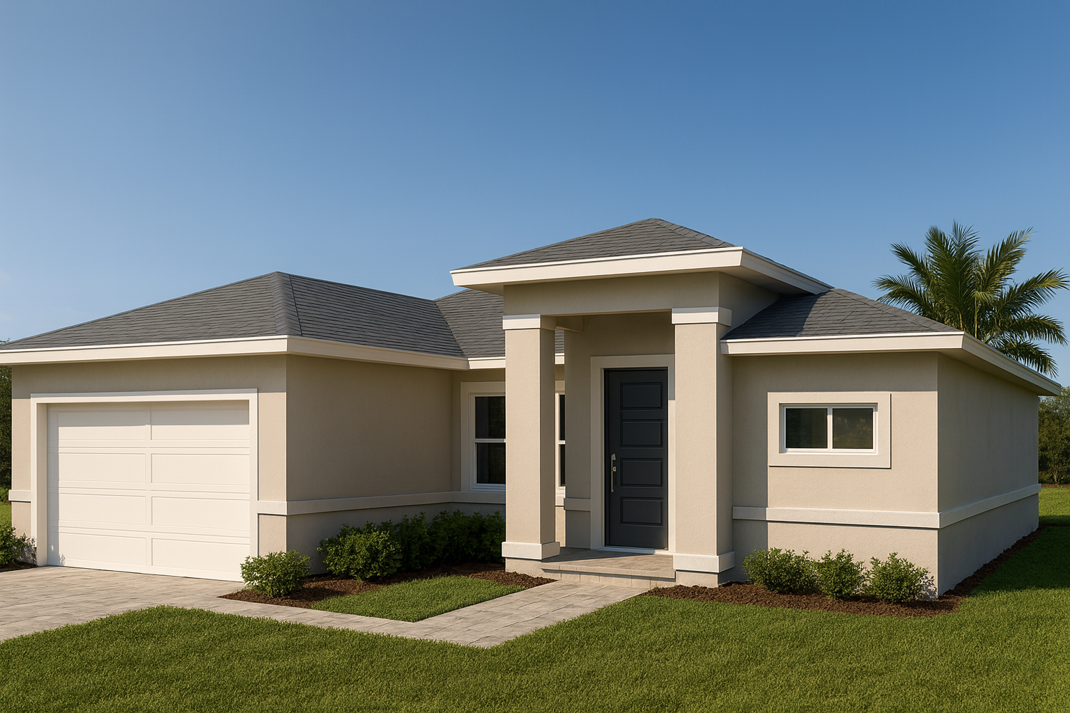 generate a photorealistic image of the same modern florida style house shown in the reference image do not change any materials proportions colors or lighting conditions render the house from a direct frontal camera view elevation view centered perfectly on the entryway and garage the camera should be at human eye level perpendicular to the house fa ade showing the front in full symmetry ensure the roof pitch overhangs and proportions remain identical to the reference materials and finishes smooth light beige stucco walls white trims fascia and moldings medium gray shingle roof charcoal gray modern front door white flat panel garage door white aluminum window frames with clear reflective glass paved light gray driveway and walkway green grass lawn and simple florida style landscaping with trimmed bushes lighting and environment maintain the same natural daylight afternoon sun with soft shadows clear blue sky and palm tree background balanced exposure and realistic reflections on windows framing capture the entire fa ade including the garage entry porch and right side wall keep the house perfectly centered in the frame with no cropping show a small portion of the lawn and driveway for context