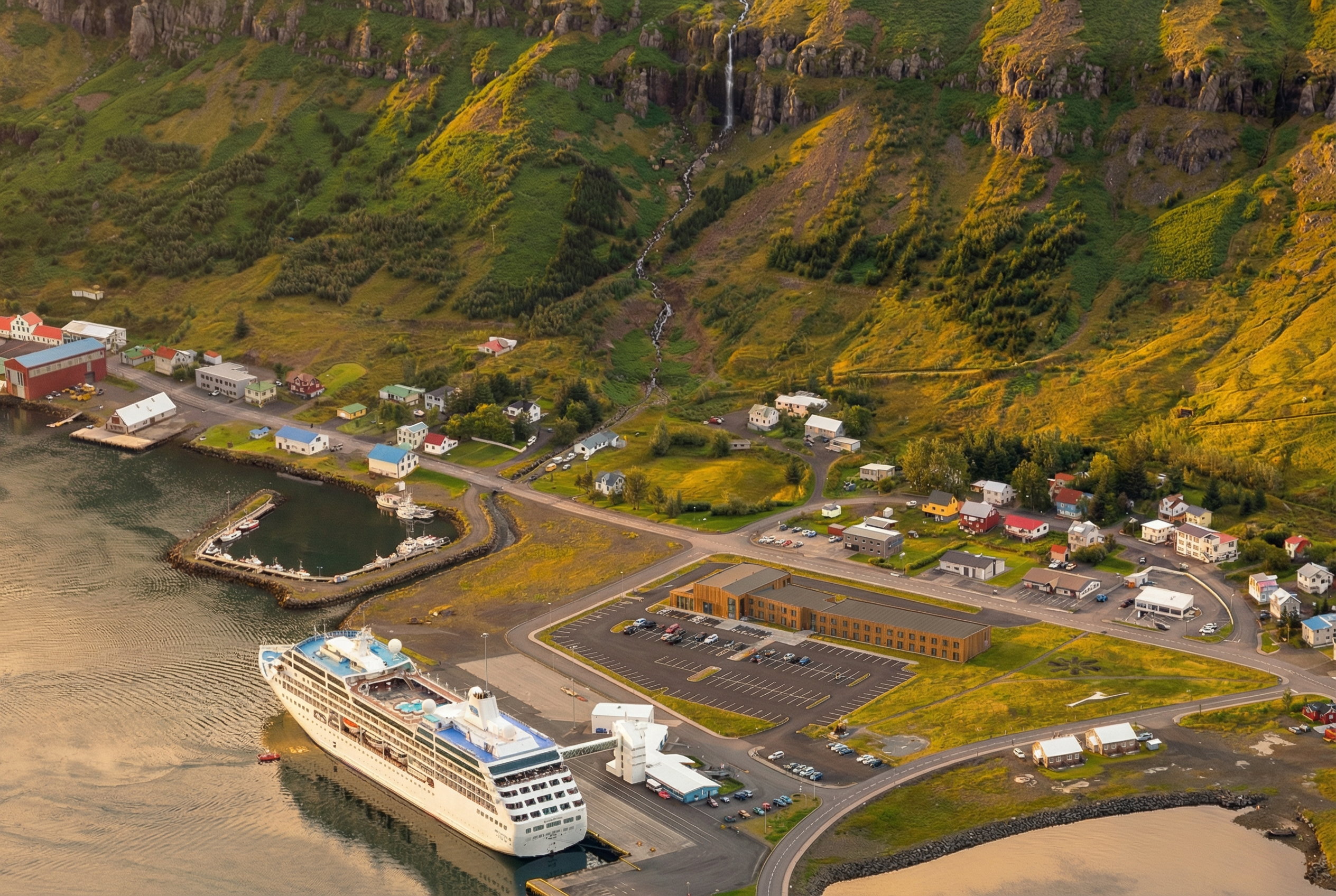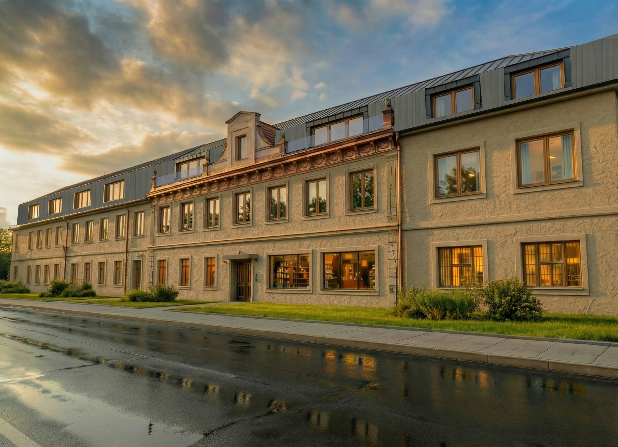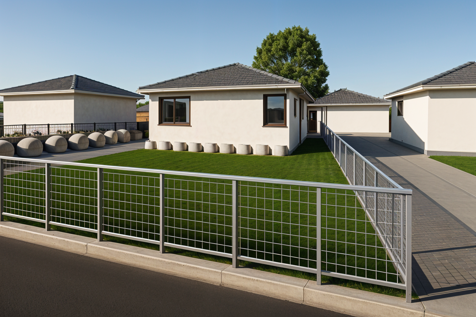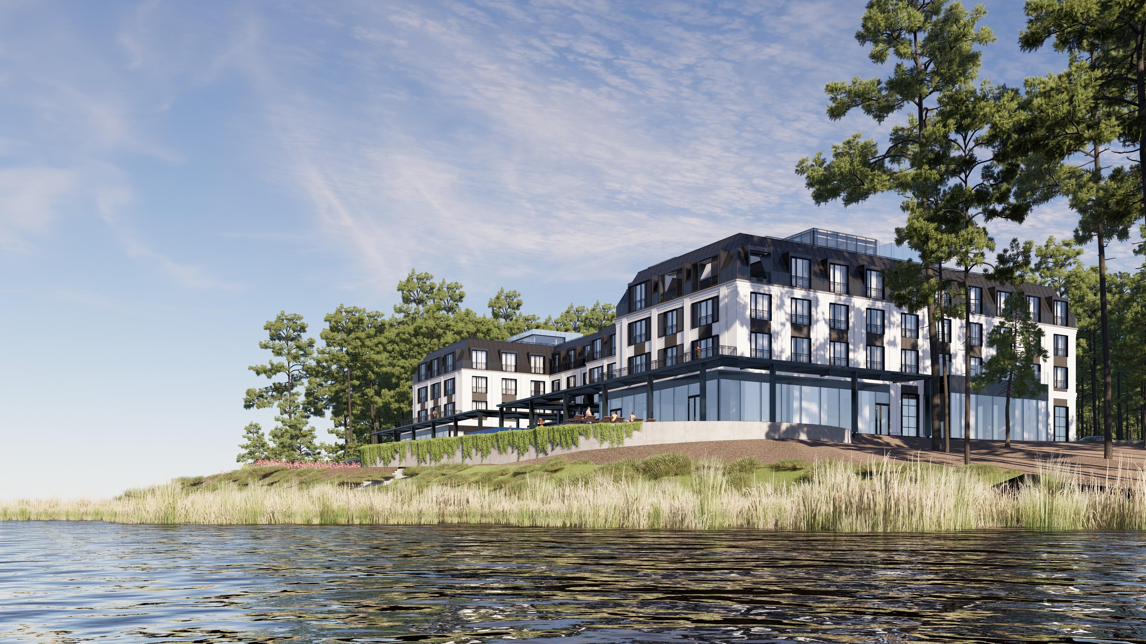 transform this image into a hyper photorealistic architectural visualization replace all non realistic materials with lifelike versions maintaining the dominant color palette add natural subtle sheen and glossy highlights on metals glass wood surfaces create realistic textures on concrete plaster and fabrics with micro details change background to serene lake region surrounded by dense forest enhance surrounding environment to ultra realistic quality while preserving exact structure and shape of bushes trees grass and lake detailed bark textures with moss on trees natural leafy density variation on shrubs short grass blades mixed with soil patches reflective lake surface with gentle ripples realistic water depth and shoreline details add precise environmental reflections in every glass pane capturing surroundings bright high key lighting throughout with even daylight illumination no harsh shadows clear blue sky with soft clouds ultra detailed 8k photorealistic render professional architectural photography style