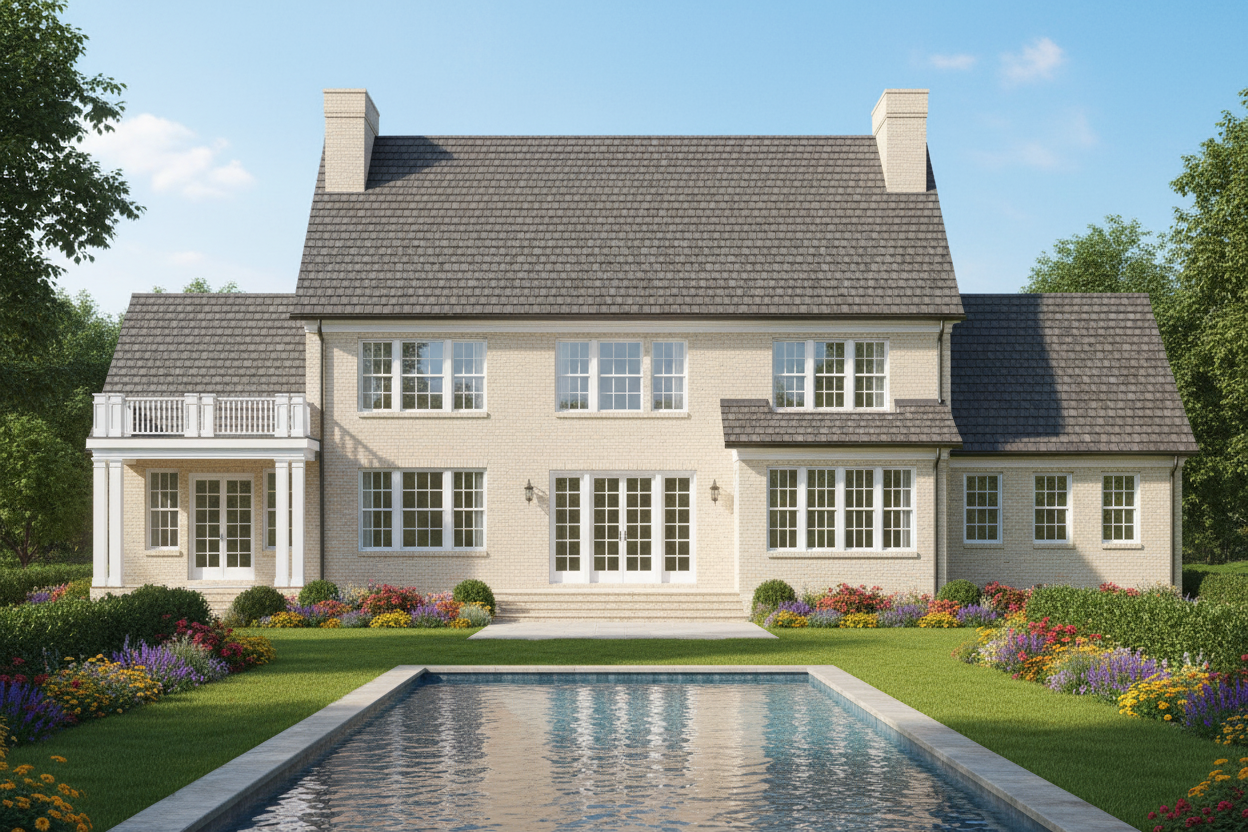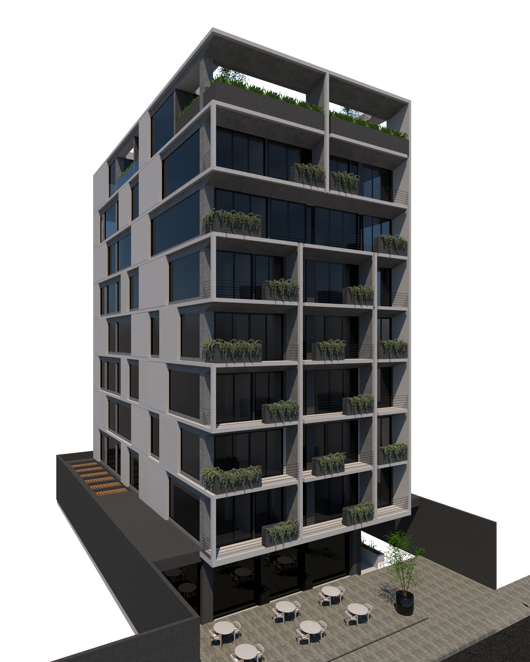 exterior shot exterior shot stunning urban street scene featuring a modern sleek apartment building the building has a minimalist gray facade accented by dark reflective glass windows vertical planters host lush greenery cascading softly from each balcony adjacent a classic brick building adds contrast with warm red and brown tones the street below is bustling with life people casually walking a tree providing fresh greenery and a cafe with beige umbrellas and seating the ground has a neatly paved sidewalk next to a subtle stone wall the atmosphere is vibrant and contemporary filled with bright natural daylight that casts gentle shadows suggesting a peaceful sunny afternoon in the city architecture architecture