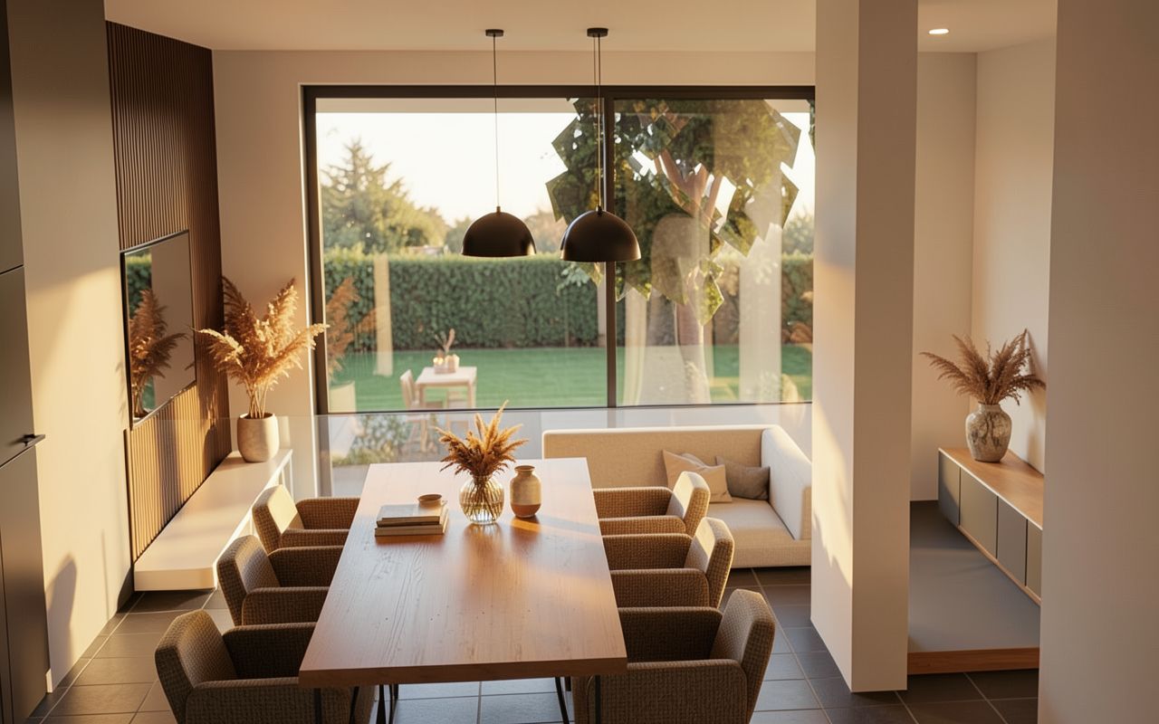 add some small plants and green grass with flowers around the building also some small trees there may be some pavement around the building it is a sunny day in the late afternoon