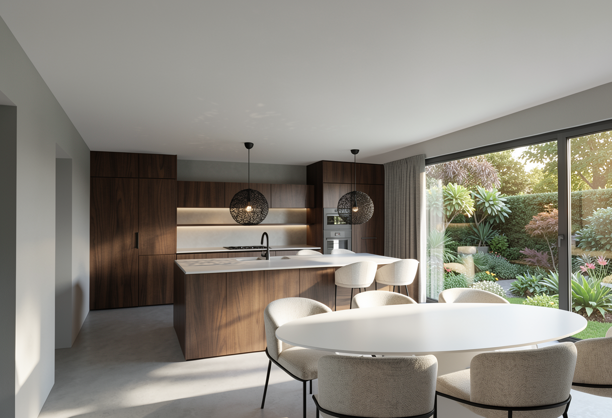 render a modern kitchen interior with a refined and elegant atmosphere use rich dark walnut wood for the cabinets and island the countertops and the backsplash both under and on top of the floating wall units should be a light microcement matt finish the pendant lights hanging above the island are black and intricately designed casting delicate shadows the chairs around the white round dining table are upholstered in a soft off white fabric paired with minimalist black metal legs through the large sliding glass doors which run all the way to the ceiling display a luxurious outdoor seating looking over a lush green garden full of vibrant foliage basking in soft afternoon sunlight the walls are smooth and light creme enhancing the clean contemporary japandi feel