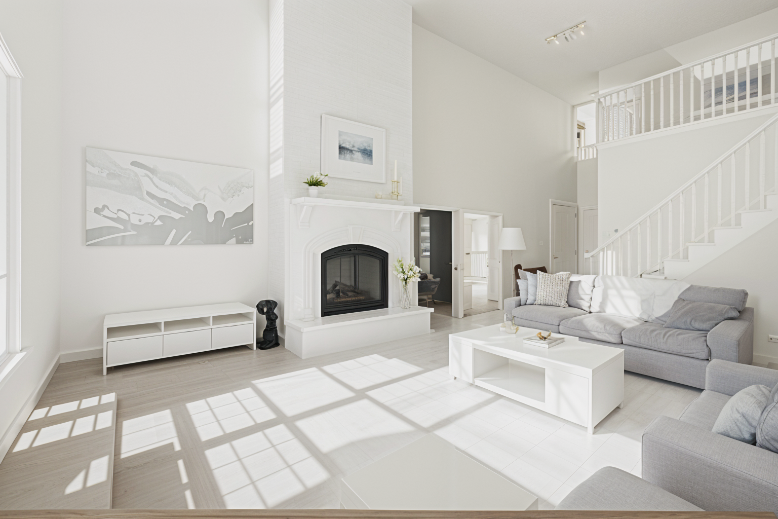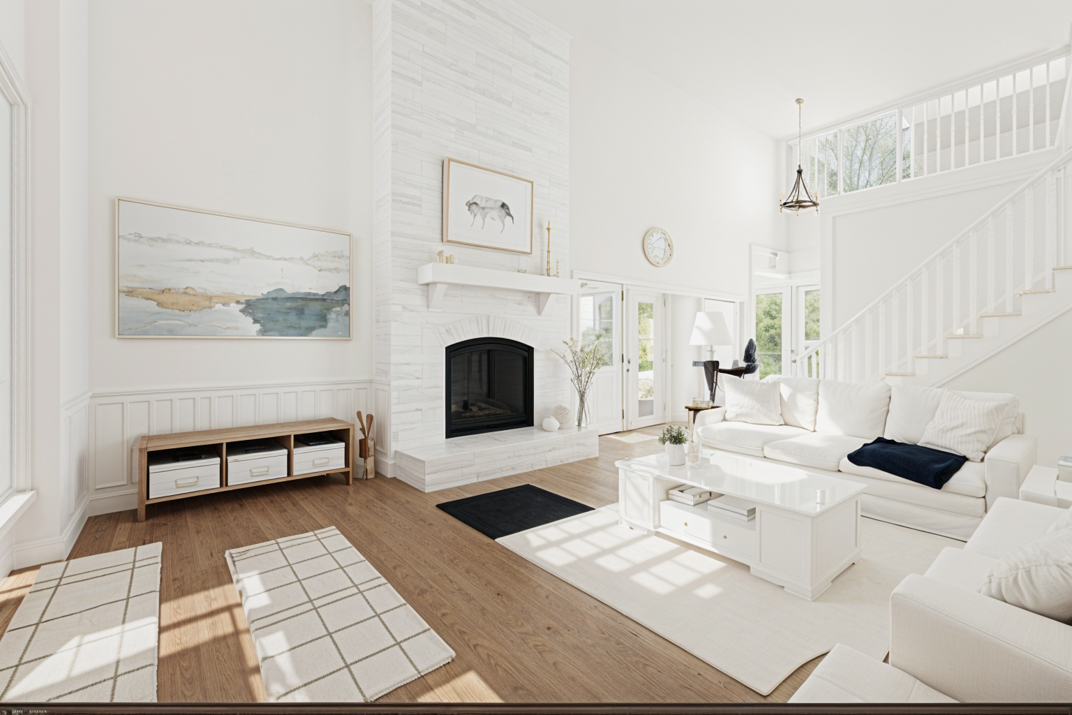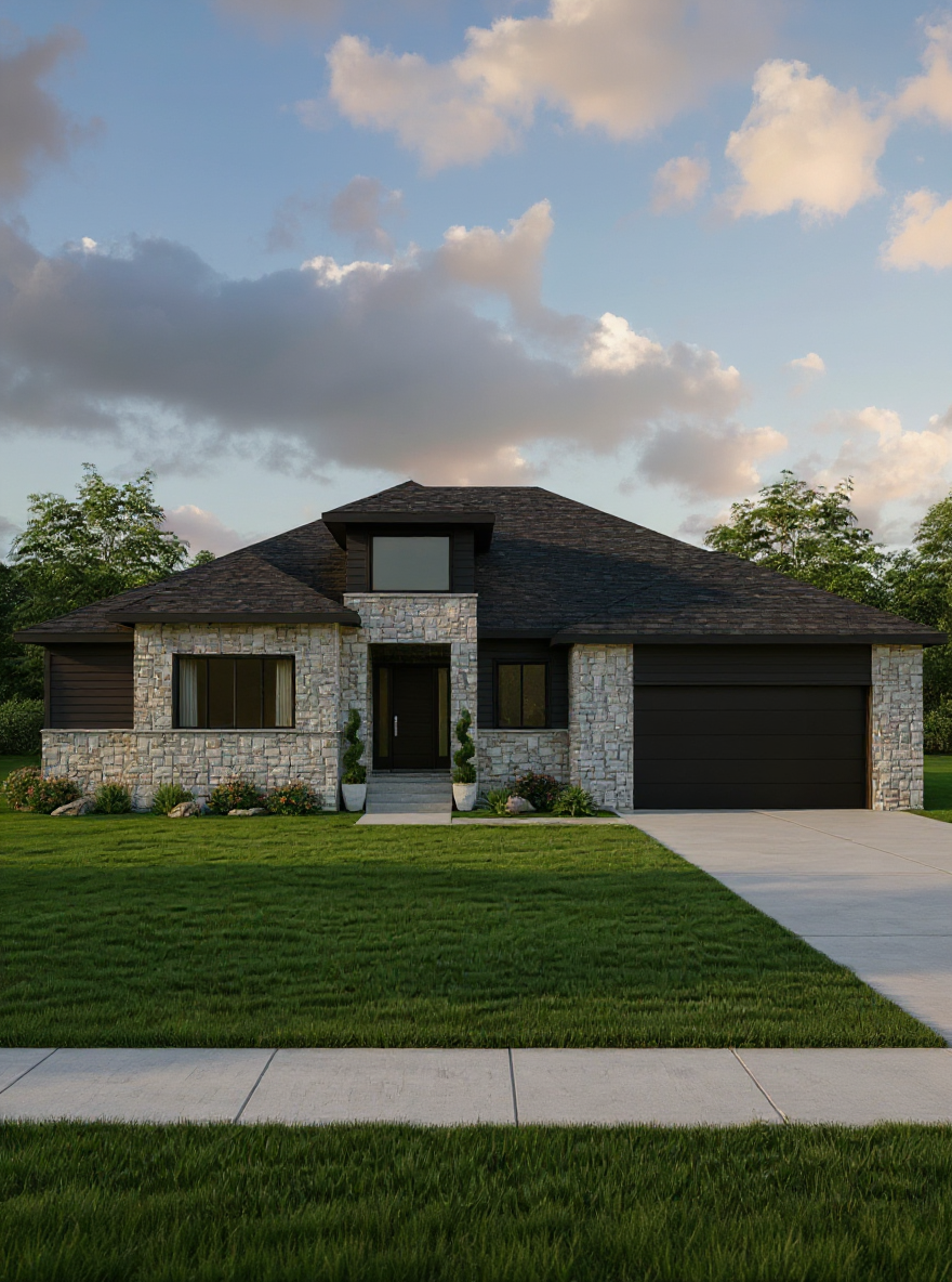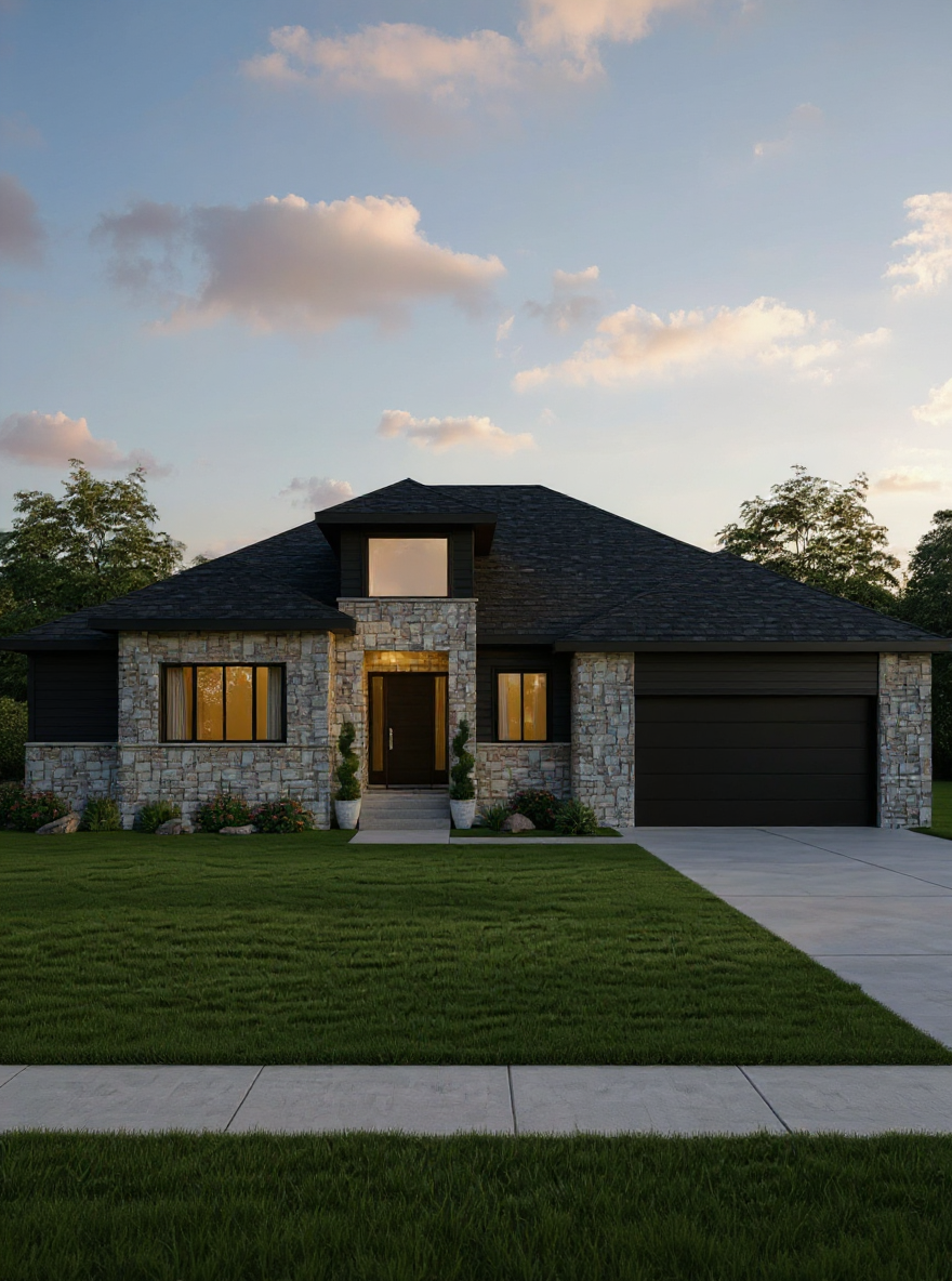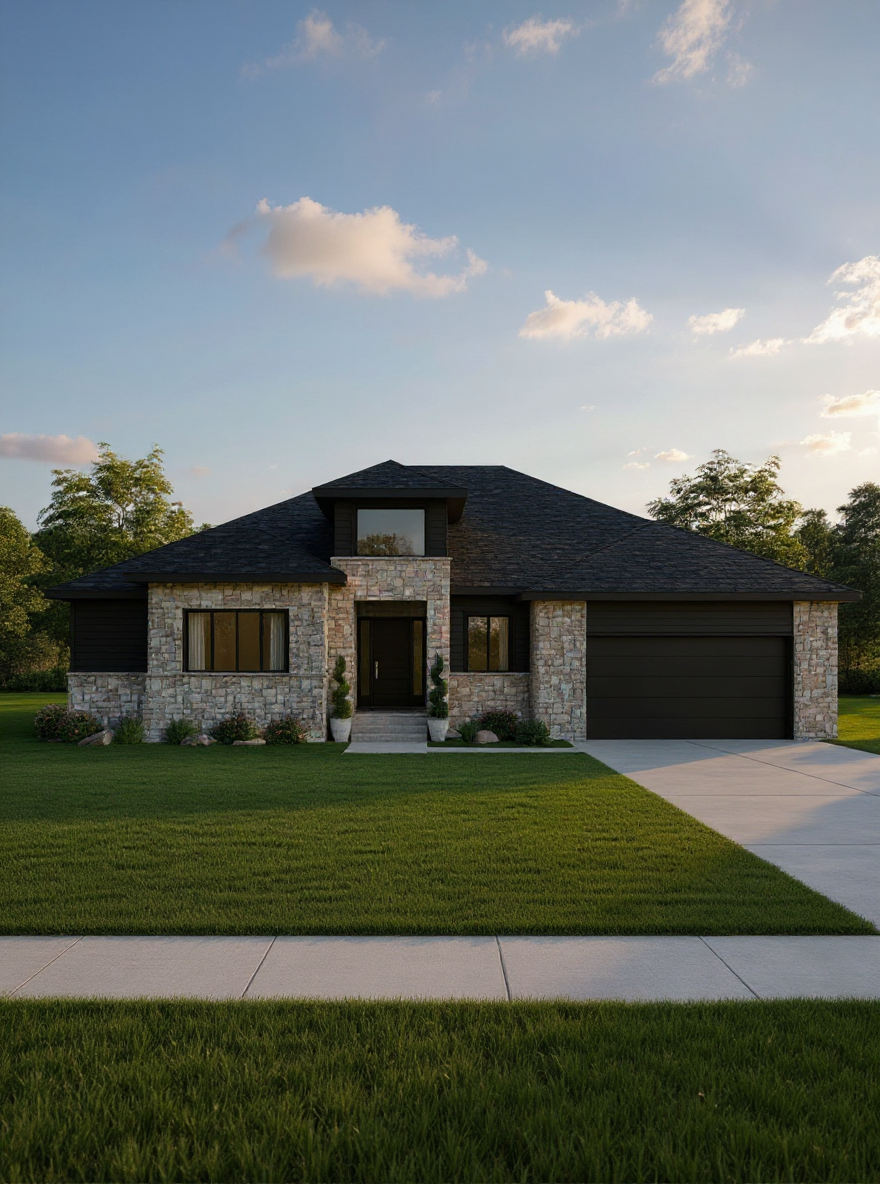 wide the view and enhance detail smooth the face of the sone and add land scaping left and right have more depth add more sun and smoothe shade add more grass to picture ad light inside the house thru the windows show interior add more sun light