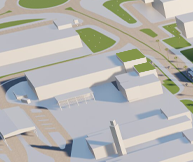 two warehouse buildings with white sandstone and square glass windows that are slightly misaligned there are green roof areas with a nice terrace