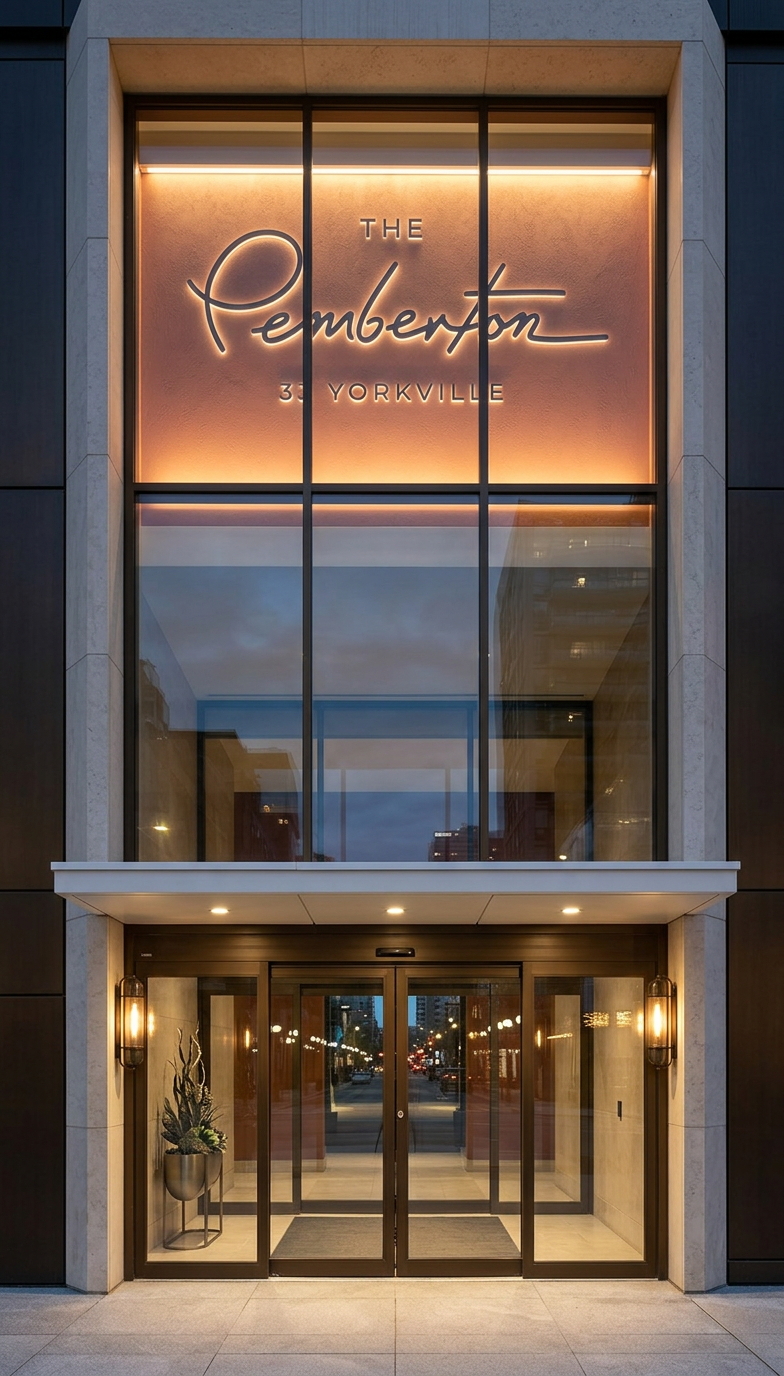 create a photorealistic architectural rendering using the uploaded image as the base reference maintain the same architecture proportions and composition but refine materials colors and lighting architecture keep the same entrance composition rectangular canopy projecting above the entrance glass curtain wall above the canopy revealing the floor slab behind the curtain wall there is a warm terracotta burnt orange feature wall with the illuminated building logo glass entrance doors below the canopy with elegant metal framing the two center doors are automatic sliding doors with no handles material changes update the facade materials wall cladding in dark bronze brown metal panels with subtle vertical joints entrance frame and portal finished in light stone limestone or light architectural stone framing the curtain wall and canopy opening canopy finished in cool silver metal or brushed aluminum curtain wall frames in white aluminum glass clear and reflective lighting warm 3000k architectural lighting recessed downlights under the canopy similar to a luxury hotel entrance soft led backlighting behind the logo light washing the curtain wall from above the canopy important wall sconces replace the existing wall sconces with smaller more refined fixtures reduce the size of the sconces by approximately 30 40 move the sconces slightly higher on the wall slim vertical modern sconces with warm light properly scaled relative to the entrance doors atmosphere evening dusk lighting cinematic reflections on glass and metal luxury yorkville condominium aesthetic clean urban sidewalk camera same frontal perspective as the original image slightly wide architectural lens 24 35mm symmetrical composition centered on the entrance important instruction preserve the architecture but redesign the materials and rescale the wall sconces