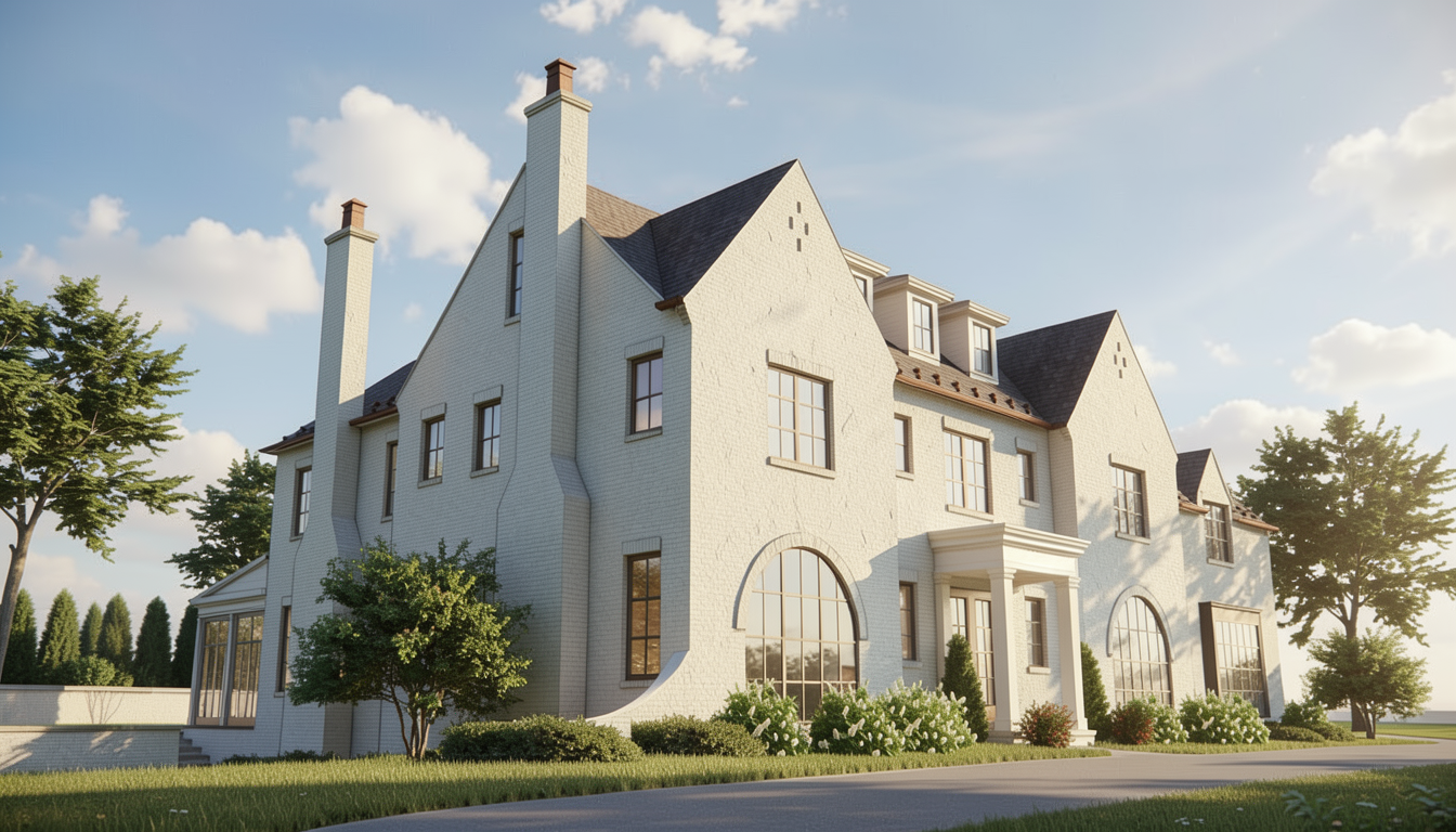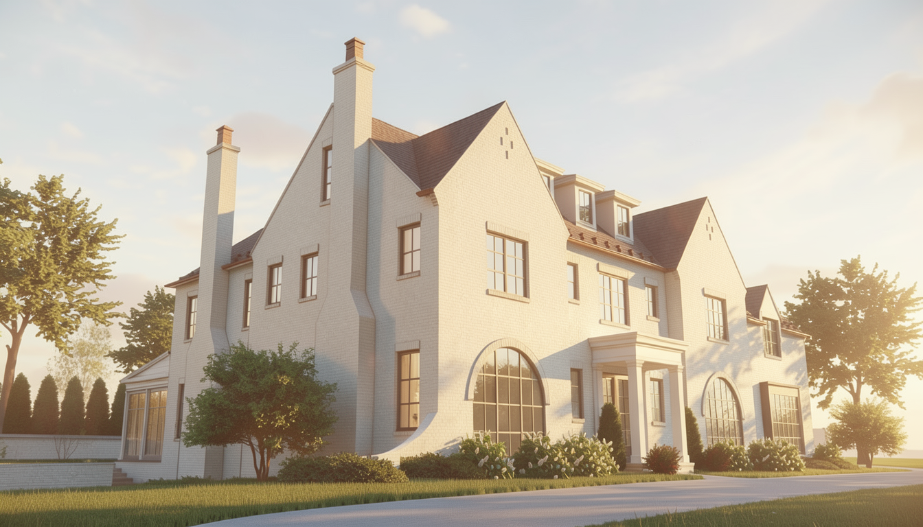 exterior shot make as photorealistic as possible while keeping all architectural elements the same as selection add professional landscaping on a lightly wooded scene with good lighting