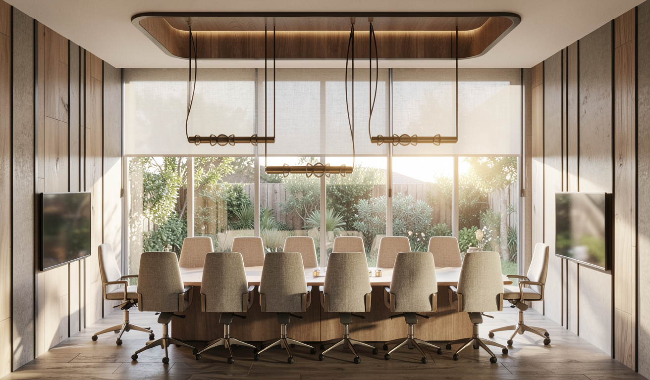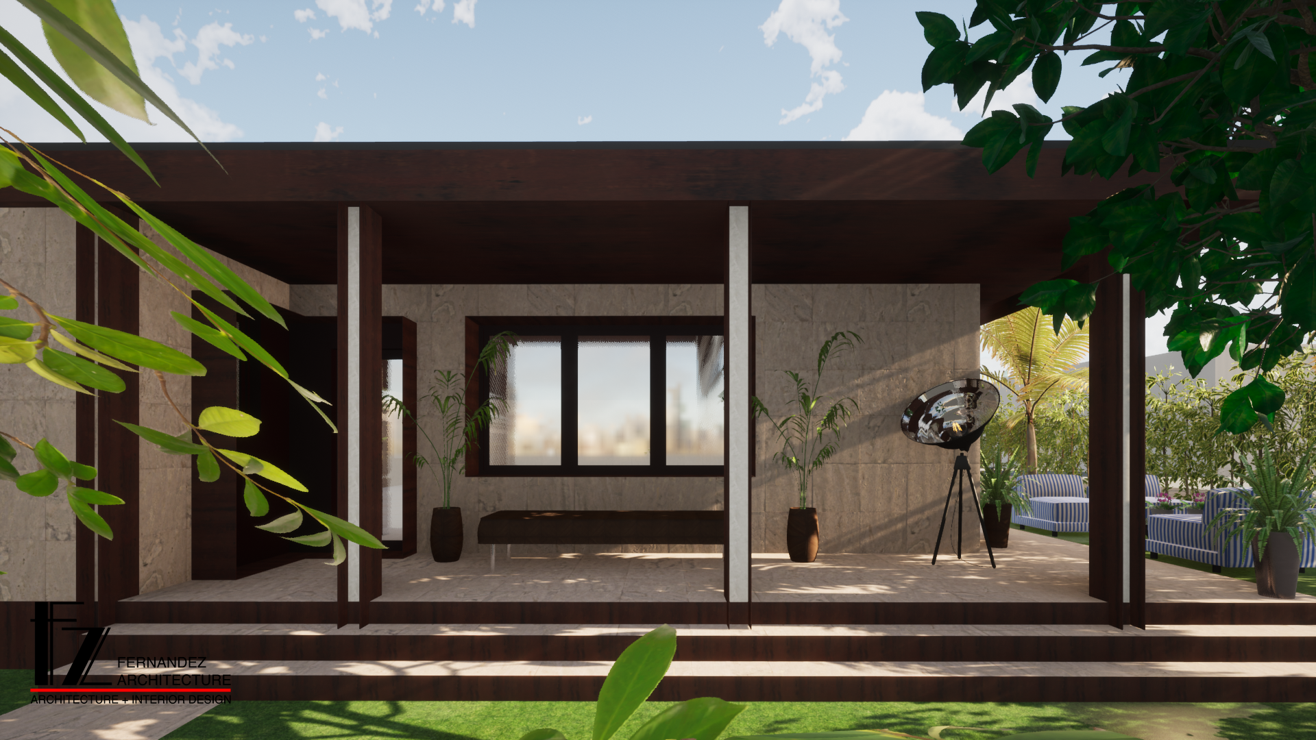 modern architectural house surrounded by lush trees create a vibrant sunny atmosphere use soft beige for the house exterior deep brown for the wooden panels surrounding trees should have rich green foliage and the grass a lively green the sky is a clear bright blue include a blue sports car in the driveway casting soft shadows on the ground the scene should feel peaceful and inviting capturing the essence of modern living in nature
