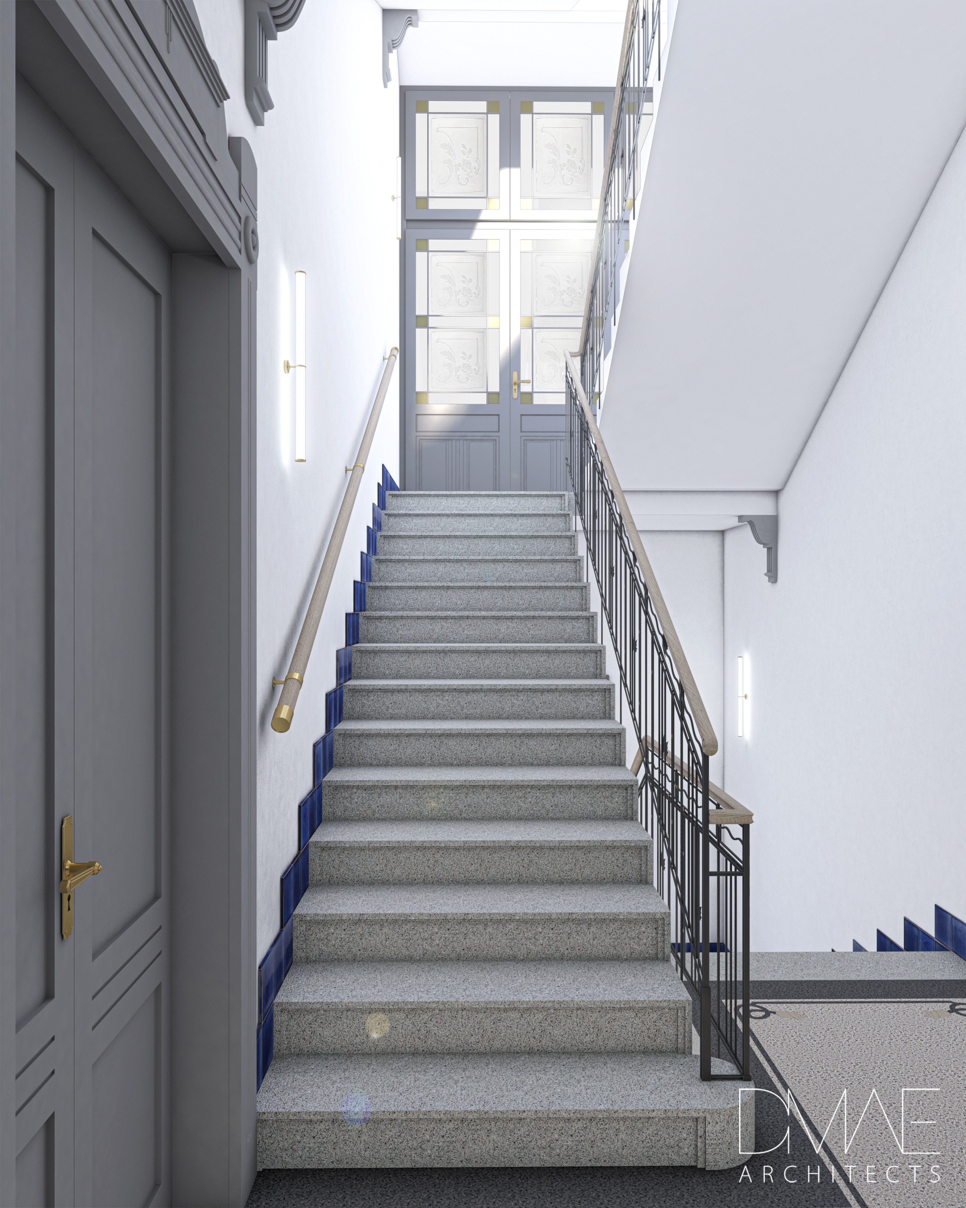 photorealistic visualization of the interior soft light semi matt gray color terrazzo floor color according to the picture plaster white natural terrazzo floor