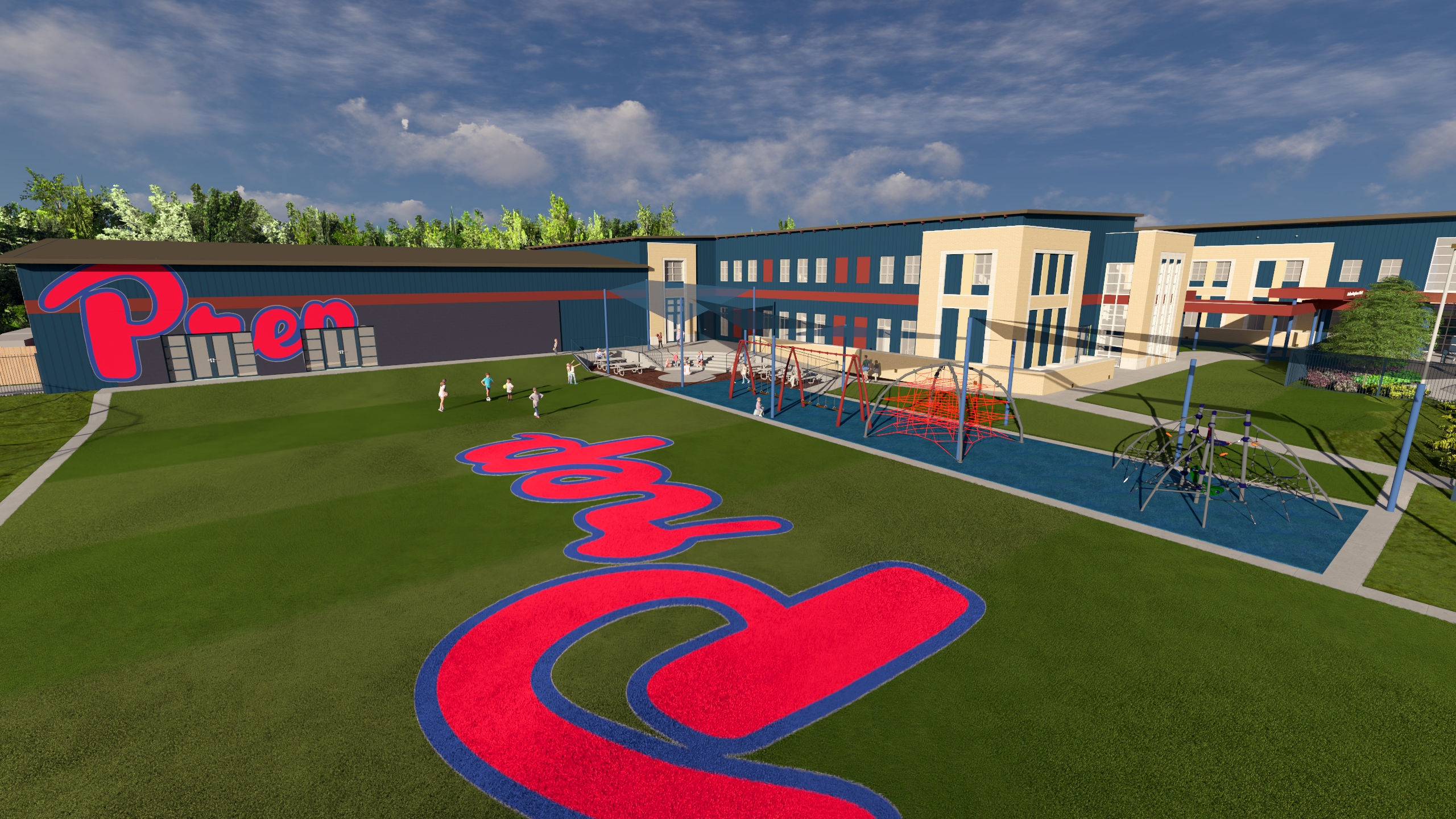 do not change the building materials or alter the colored graphics the blue area is blue turf it looks like water make it look like turf
