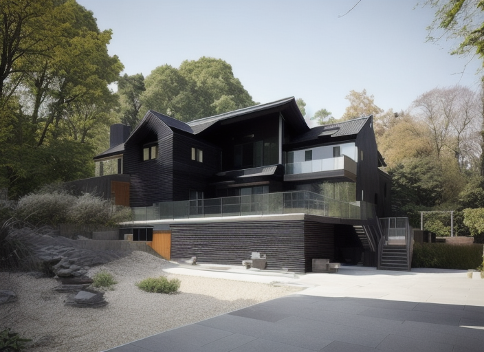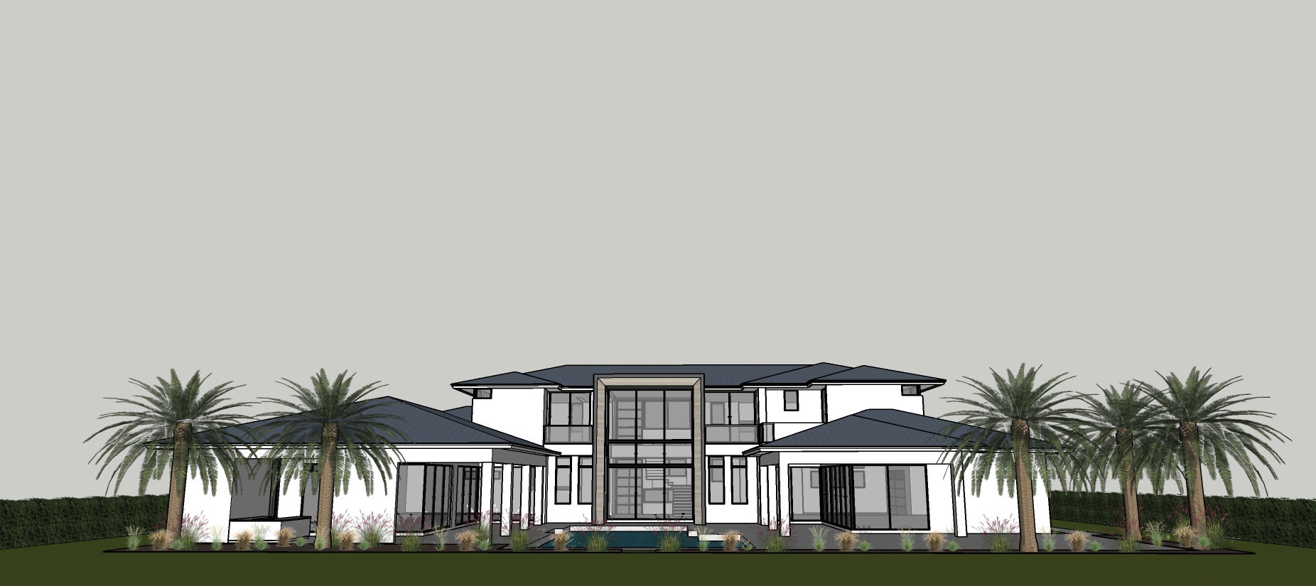 a modern rear of two story house with white walls and a dark gray metal roof featuring large glass windows in the center the house has a prestine blue pool water with a marble stone pool deck the rear yard is landscaped with lush green grass hedges and palm trees creating a tropical feel surround the house with vibrant multi colored flowers and decorative grasses the atmosphere is serene soft shadows and light reflections highlight the architectural features and the tranquil ambiance