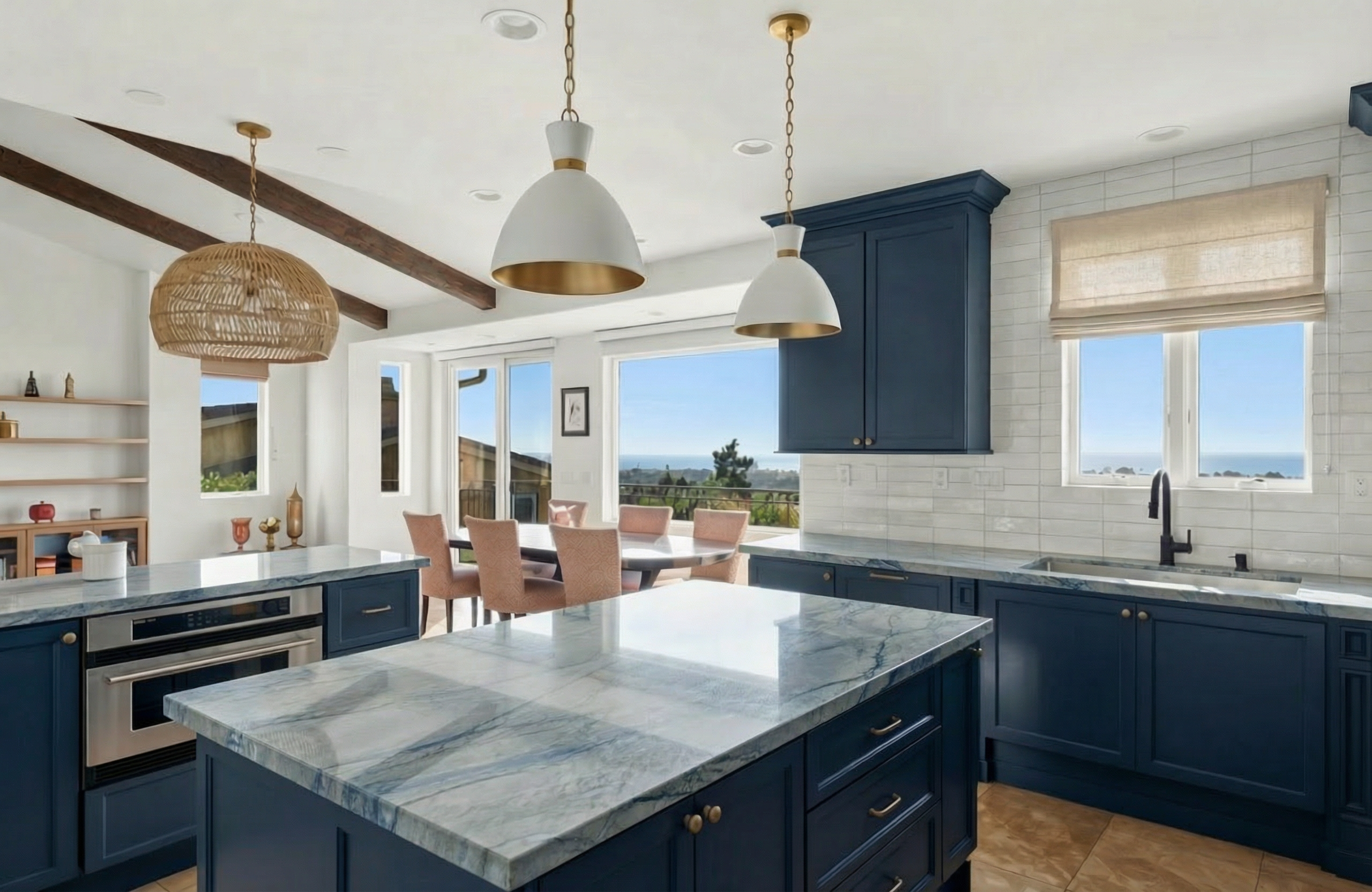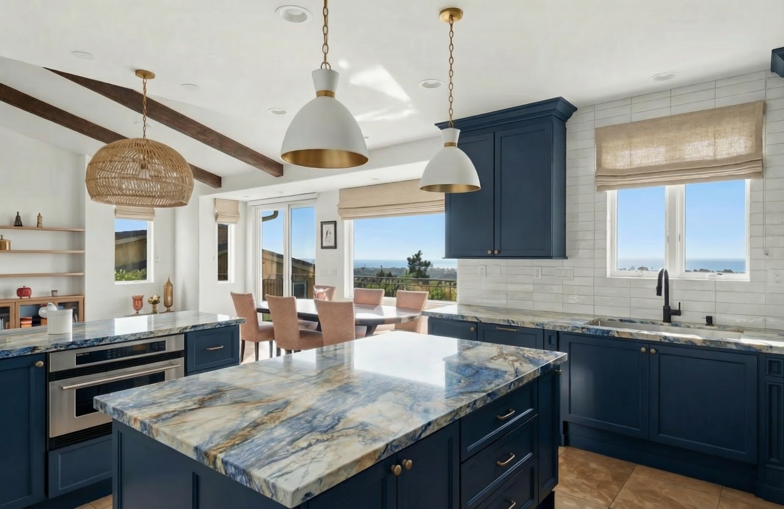 create photo realistic rendering keep all details and lighting as is add linen roman shade outside mount window change perimeter countertop to light quartzite change all cabinets to benjamin moore smokey taupe