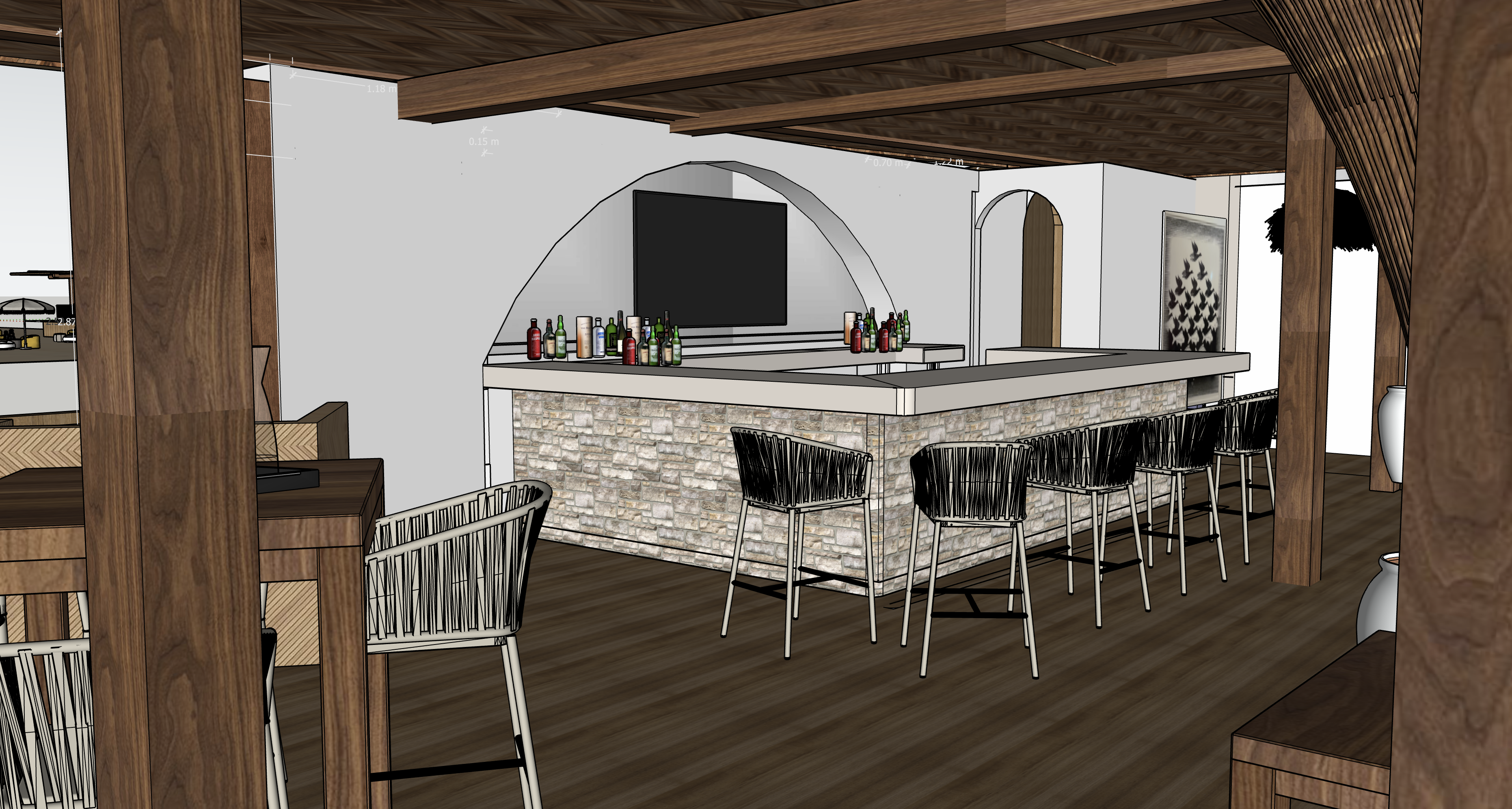 mediterrenean restaurant interior curved stone bar with indirect lighting wooden floor flat mirror backdrop all with indirect lighting in any curved space bottle displays and olive color bar stools