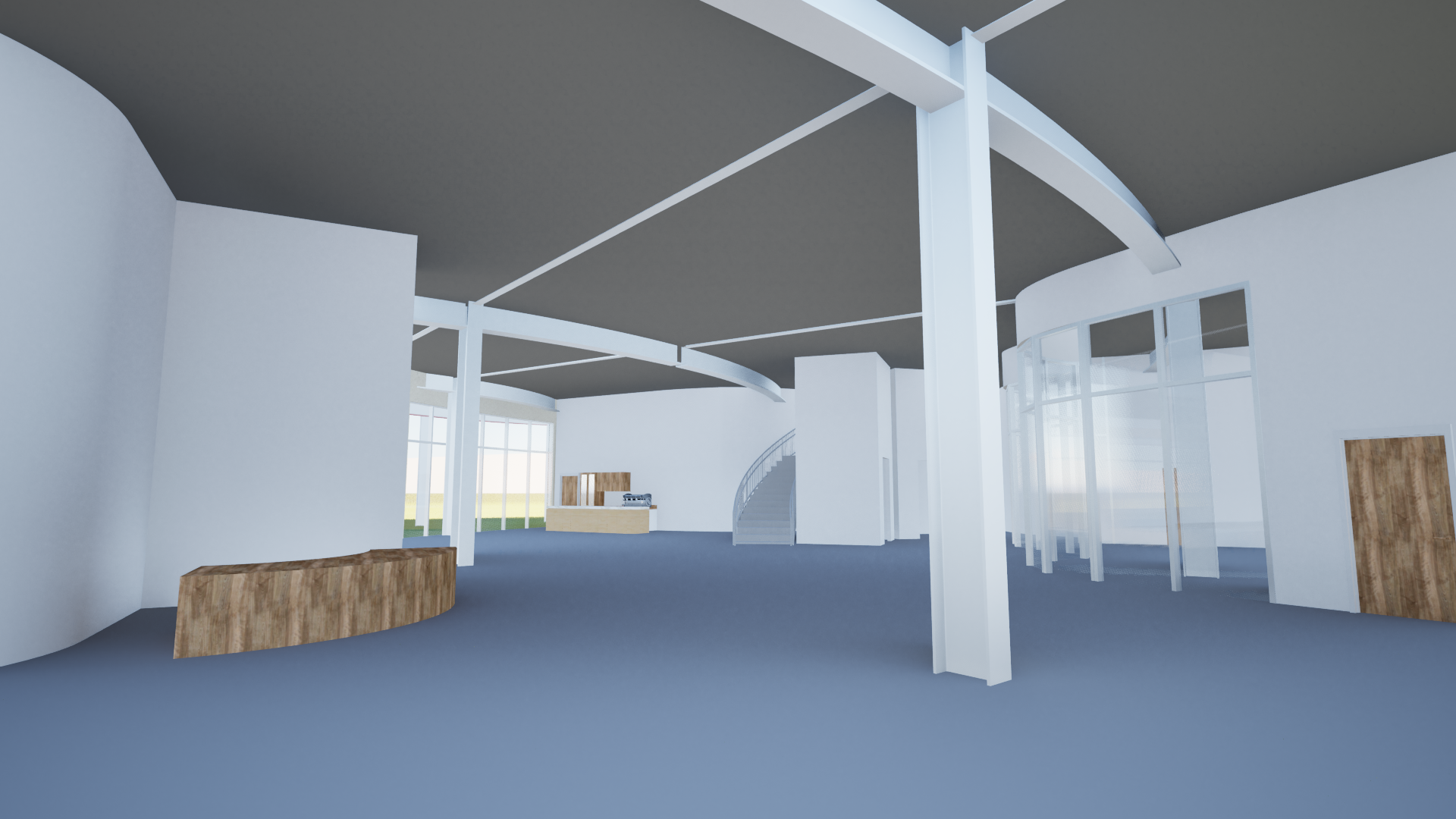 make a cafe area in the back by the counter tops and decorate the reception desk add some seating for the lobby and all behind the glass windows on the right side make it a costume display make it elegant but miami inspired