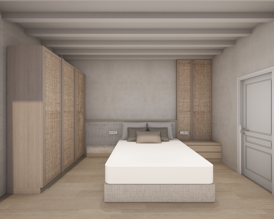 create a highly realistic render of an interior bedroom with a calm and serene atmosphere the headboard is upholstered in a white beige linen fabric creating a soft and elegant focal point on the right side the tall headboard section features a luxurious rattan texture the bed is dressed with perfectly ironed impeccably arranged bedding and pillows styled like in a five star hotel the sheets and duvet are crisp smooth and completely wrinkle free the two back pillows are in an off white tone the middle pillows are in a taupe beige shade and the front decorative pillow features a light beige linen fabric adding texture and depth through layered styling the bedside table on the left has a polished cement texture in a beige tone while the one on the right is made of light oak wood on the right side of the bed there are pendant lights exactly like the reference photo ultra realistic render high resolution interior design magazine photography style keep the initial design and layout of the space the lighting should be natural but neutral allowing all materials to appear clear and accurate fabrics wood rattan and all other textures must look clean crisp and true to their real colors without color distortion or heavy shadows all materials should be clearly visible well defined and perfectly clean