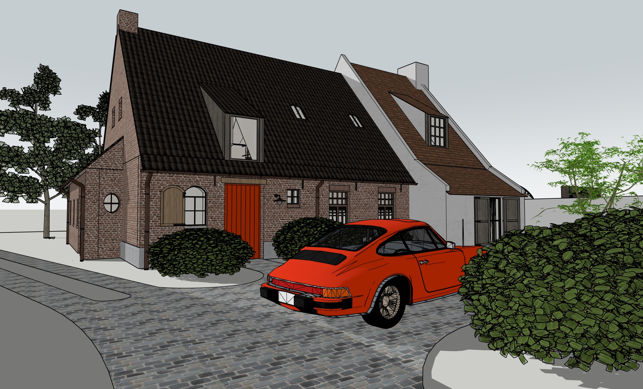 a villa with two connected buildings in a natural setting with a few trees in the background the left part of the building is constructed with handmade brick while the right part of the building is built with brick finished in white limewash the roof consists of two distinct sections the left roof section has dark grey roof tiles and the right roof section has red rustic clay tiles surrounded by natural grass preserve all original materials colors architectural compositions and proportions exactly as described the outdoor surfaces are finished with handmade cobblestones with natural grass growing organically between the paving create a cozy warm and inviting exterior atmosphere with soft natural lighting and a harmonious connection to nature