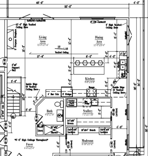 design and render an open and render a open concept space for this kitchen dining room living room combo modern kitchen with neutral organic vibes include the island and the appliances and the cabinetry as well as dining room furniture and living room furniture with a tall electric fireplace wall the wall on the side of the kitchen sink starts at 9 feet tall and it runs to 12 feet tall at the fireplace wall notice the dimensions on the floor plan and design accordingly