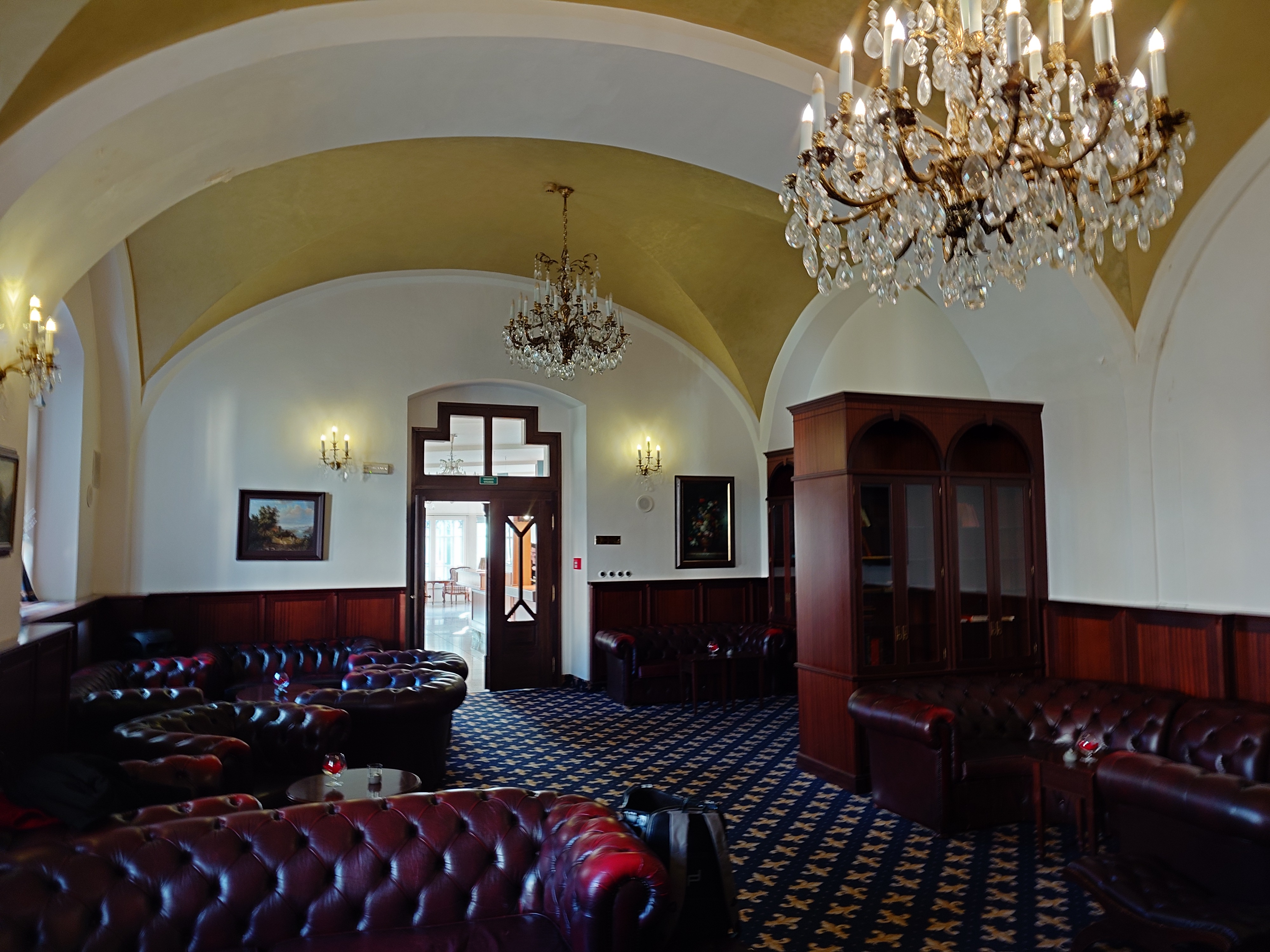 change wooden cladding to blue change ceilings to gold put modern french lamps to seating boxes light up french chateau hotel atmosphere erase wardrobe no wall lamps