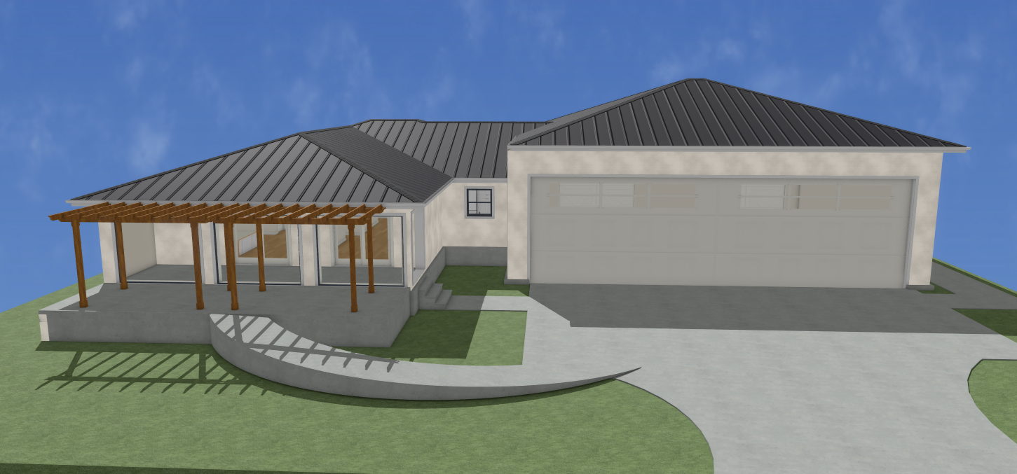 create a photorealistic image of this rendering to include tropical landscape stucco finish gray paver driveways porches and walkways white stucco exterior