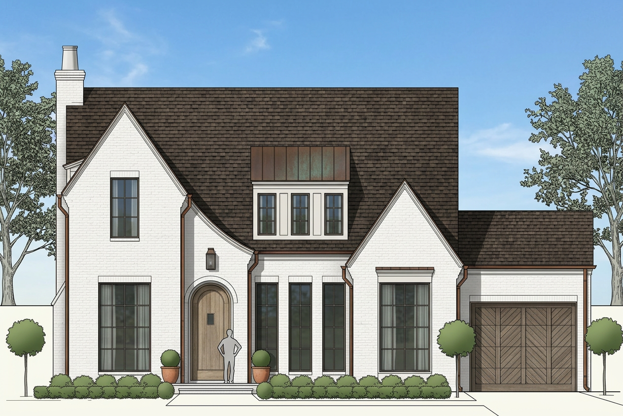render a 2d exterior elevation using the material palette and color tones from the reference photograph preserve all original lines structure and proportions of the drawing roof should be asphalt shingle in a slightly brown tone not gray dormers with copper roof front siding with clean crown molding include realistic background with sky and trees add schematic subtle vegetation to match the photo reference keeping it 2d and not cartoony ensure materials textures and tones match the reference image while keeping the original architectural lines crisp and intact