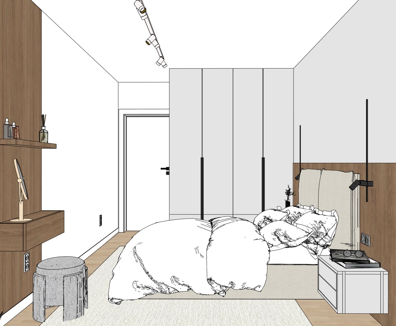 illumination in the interior as on a cloudy day transform the input interior design photo into a hyper realistic architectural visualization of a contemporary modern interior preserve exact geometry layout proportions and material intent from the original design lighting create soft overcast daylight atmosphere similar to a cloudy rainy day without visible rain with diffused natural light entering maintain balanced contrast no harsh shadows no overexposure materials textures enhance material realism micro details surface imperfections soft reflections accurate roughness physically correct light response emphasize textures wood grain fabric weave concrete metal and matte finishes high micro contrast and tactile depth rendering style ultra photorealistic architectural visualization cinematic quality natural color grading neutral tones soft highlights realistic global illumination physically based rendering high dynamic range premium interior photography style camera composition wide angle architectural lens natural perspective eye level viewpoint deep focus sharp details across the frame natural framing no distortion atmosphere calm elegant contemporary premium residential mood clean minimal refined without visual noise output 8k resolution ultra detailed noise free crisp edges professional architectural rendering quality white sockets do not add any led lighting straight ahead on the left side is a white door with a frame szafa jest kolorze bia ym ciany s bia e puf jest w kolorze jasnoszarym ze struktur splotu dodaj w czone o wietlenie w kinkietach negative prompts no rain droplets no lens flares no fog no haze no bloom no motion blur no cartoon no stylization no oversharpening no artificial glow no unrealistic reflections no distortion no clutter no led lighting no window