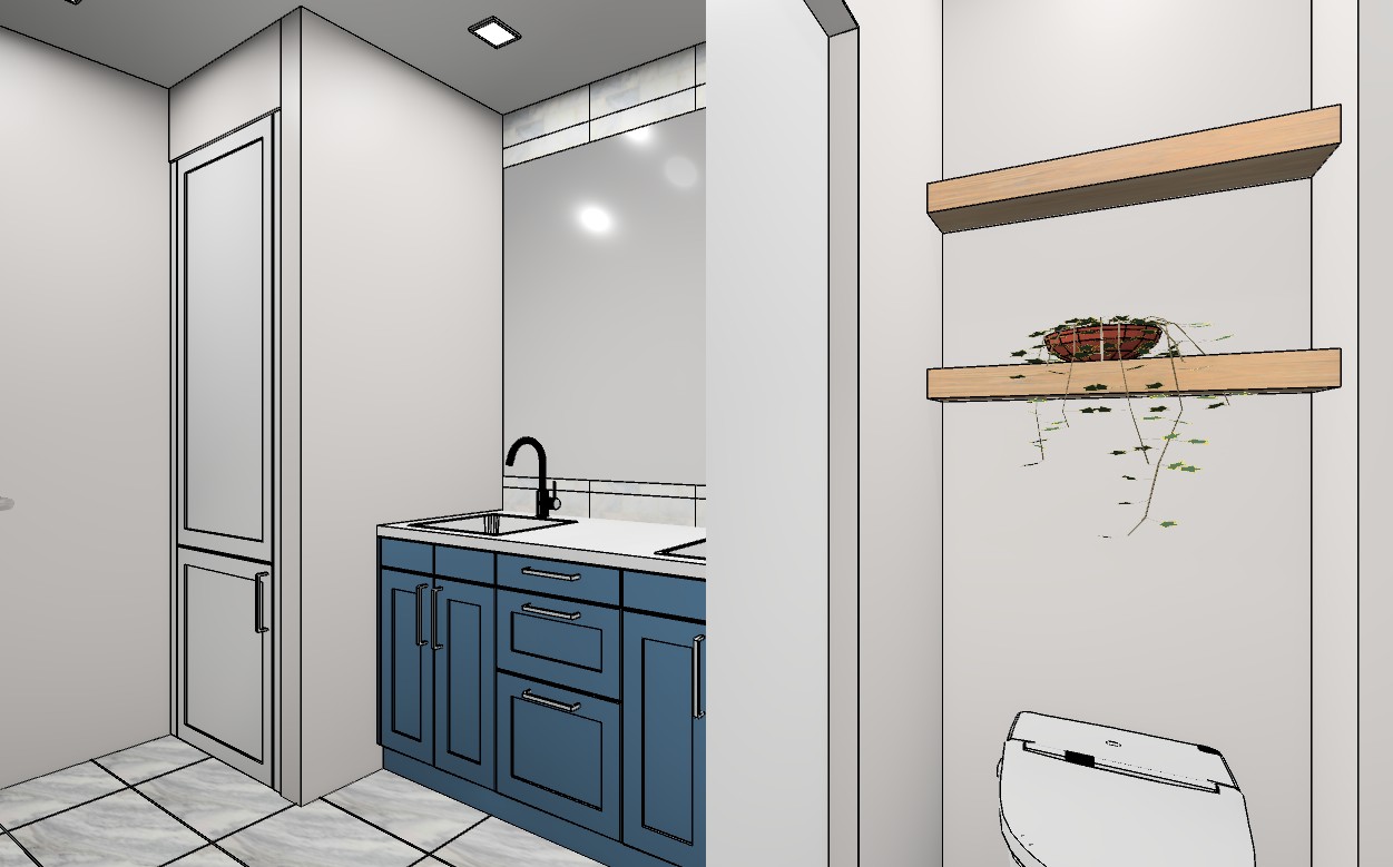 enhance the photo to be more realistic do not alter the geometry proportions or layout of the cabinets walls add a lot of natural light enhance the realism as much as possible please follow the layout precisely and do not alter anything wall tile behind mirror is carrera bedrosian tile and floor tile is glorious blue bedrosian