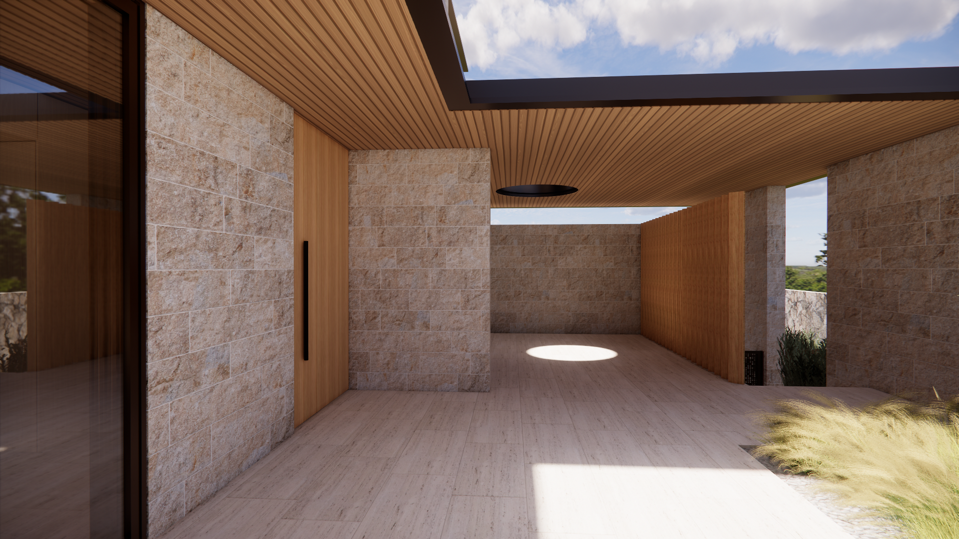 render a photorealistic 3d perspective of this house keep the current materials just enhance them split face limestone walls cream stone floors keep model geometry the same windows doors roof walls enhance the current materials and make the landscape nicer vegetation detailed shadows on cream textured limestone wall and a light blue sky with a few clouds add detailed shadows and atmospheric depth render in hyper realistic architectural visualization quality 8k resolution