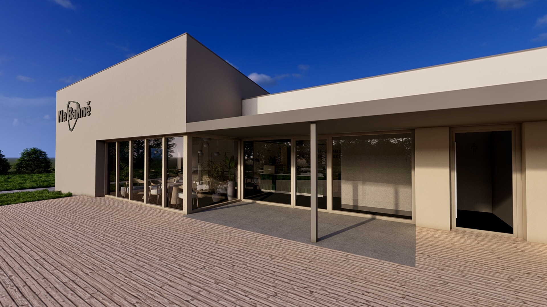 modern architectural visualization ultra detailed grainy facade texture sharp definitionl realistic people walking in motion blur on the sidewalk dramatic sky with dense cumulus clouds high reflections ray traced glass cinematic lighting 8k resolution architectural photography style