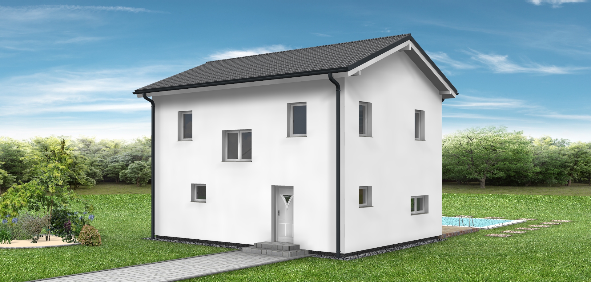 bitte erstelle f r exakt dieses haus eine realistische au enansicht dach anthrazit fassade wei fenster und haust re wei das haus soll in einem dezent modernen garten situiert sein behalte alle ma e und farben des hauses exakt bei