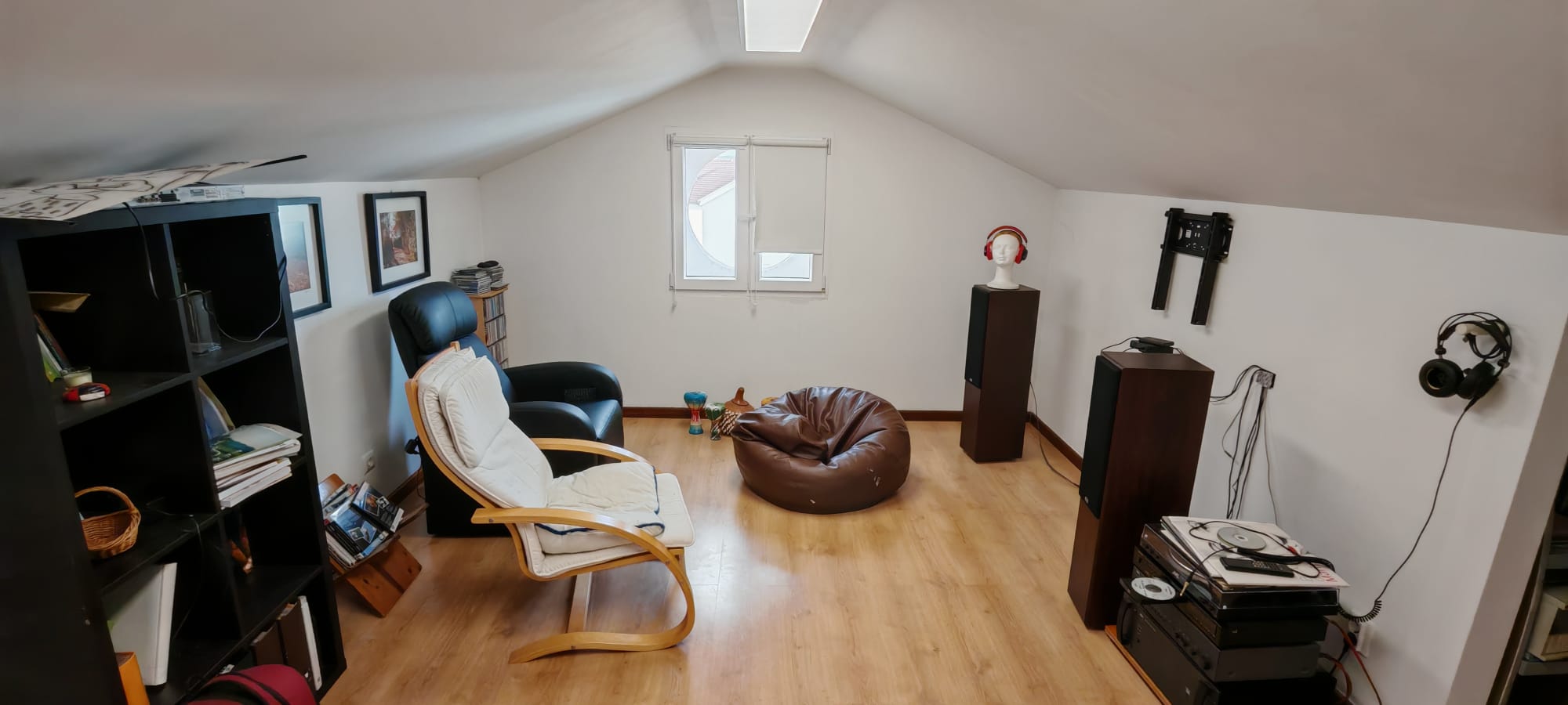 transform this attic room into an unfinished podcast studio keep the original room proportions sloped ceiling wooden floor and central window remove the existing furniture and replace it with a centered rectangular table suitable for podcast recording with four comfortable modern chairs around it on the table place podcast microphones on articulated arms headphones and minimal audio equipment but make the setup look partially incomplete as if still in progress add simple acoustic panels on the walls some decorative elements related to podcasting such as framed posters small plants led ambient lighting and soft studio lights keep a clean but cozy atmosphere modern and functional with neutral colors warm lighting and a realistic professional podcast studio aesthetic