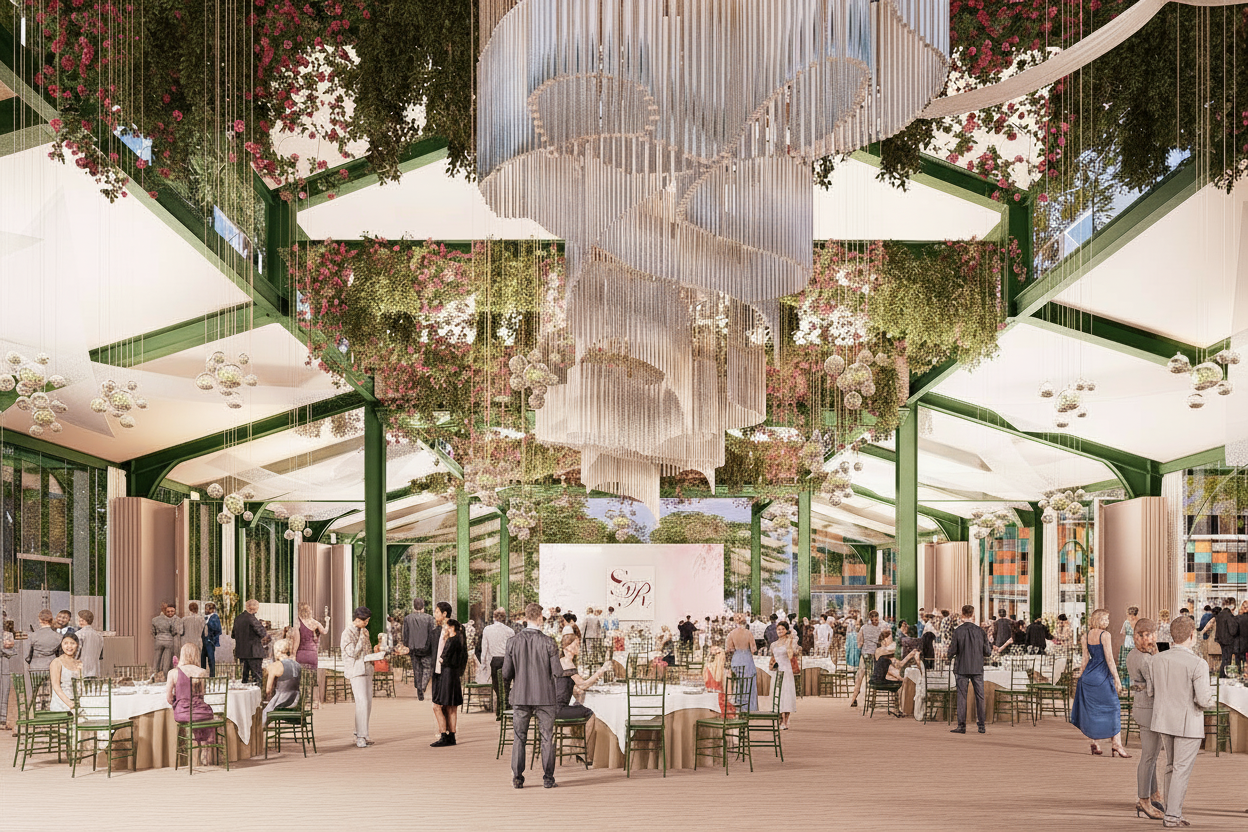 ultra realistic modern living room interior at night warm ambient lighting curved beige sectional sofa marble and walnut coffee table built in linear fireplace glowing softly dark walnut chevron wall panels oak hardwood flooring sculptural led ribbon chandelier floor to ceiling window showing dark night outside soft indirect lighting cinematic shadows realistic interior photography architectural visualization vray render corona renderer ray traced global illumination 24mm wide angle lens depth of field 8k