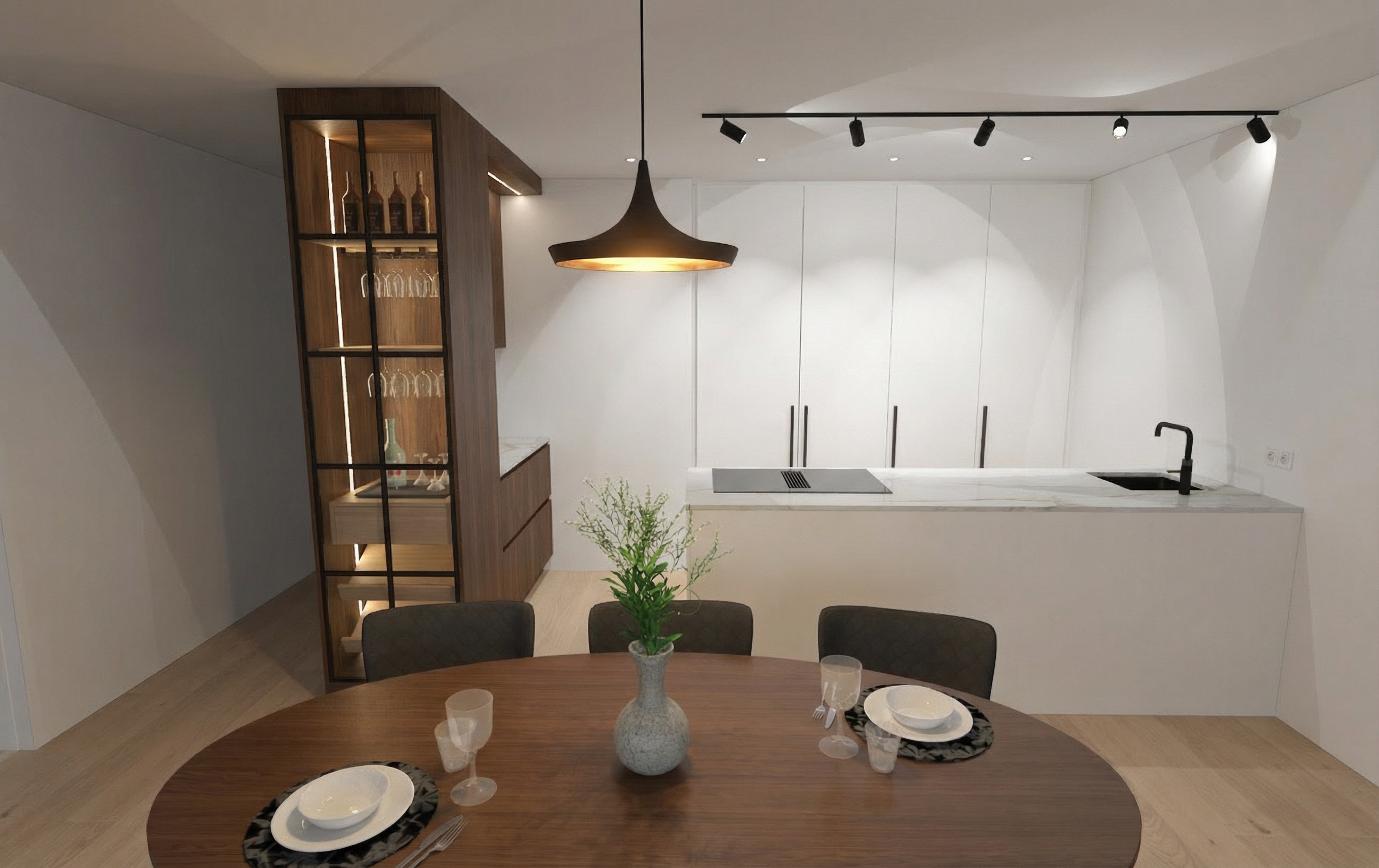the benchtop should be 6mm thick in stainless steel dont add a back splash place a cushion on the bench to the right the cushion should be white the light fixtures on the wall should look the same make the tiles on the kitchen island visable add a simple garden only outside the window