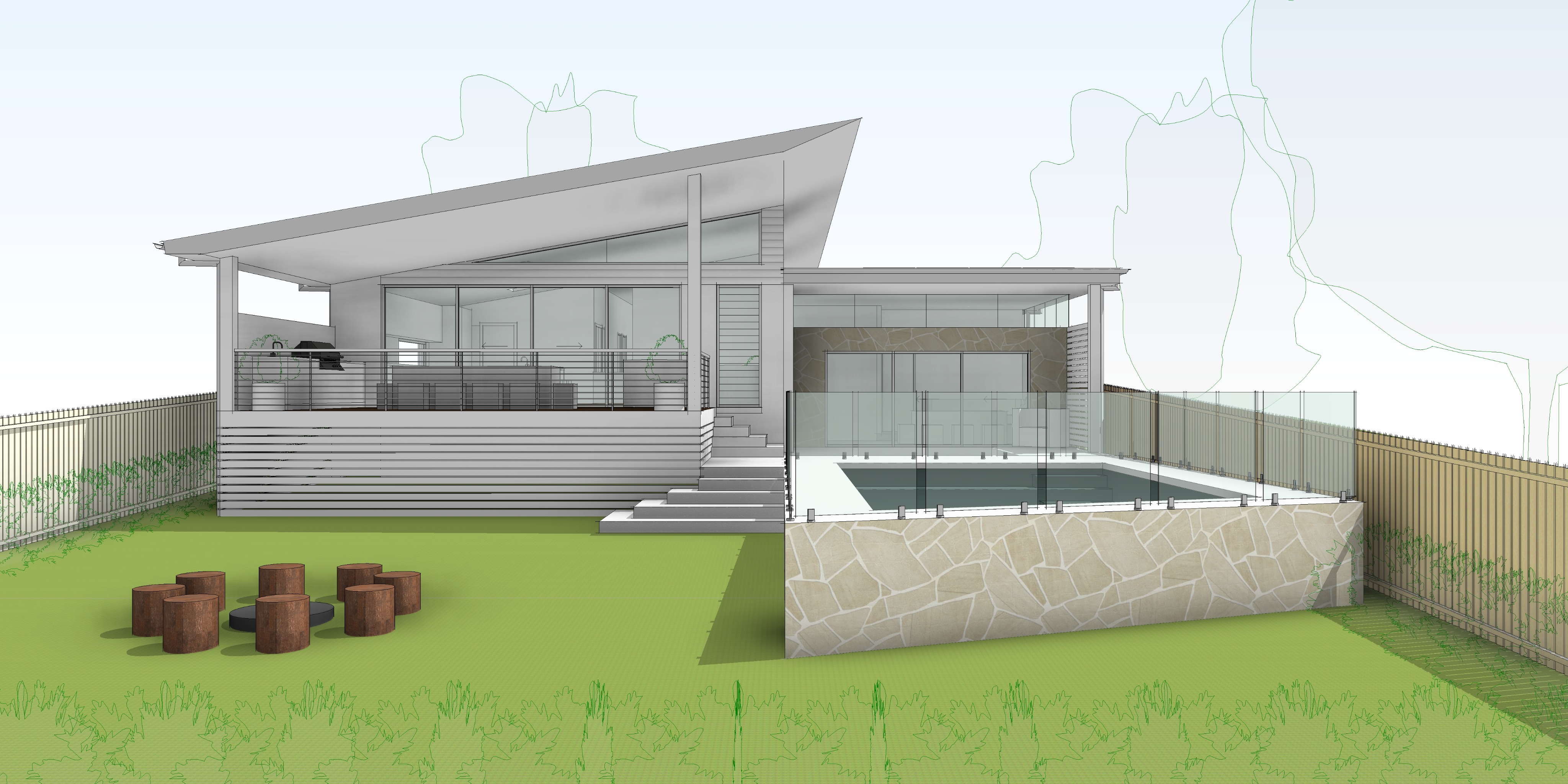 render a photorealistic 3d perspective of this house near sydney reference the current material style and enhance them white metal roof linea fibre cement cladding and sandstone walls keep model geometry the same windows doors roof walls garage door pavement driveway make a lush vegetation that looks native to australia do not change the view only enhance the current materials and make the landscape nicer vegetation detailed textures in the grass and glass reflections and a vibrant clear sky with light atmospheric depth render in hyper realistic architectural visualization quality 8k resolution