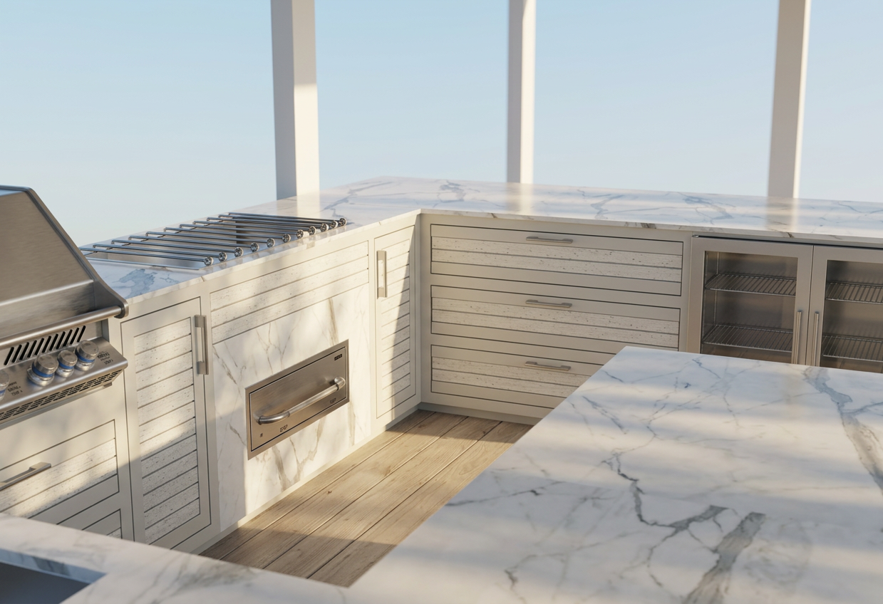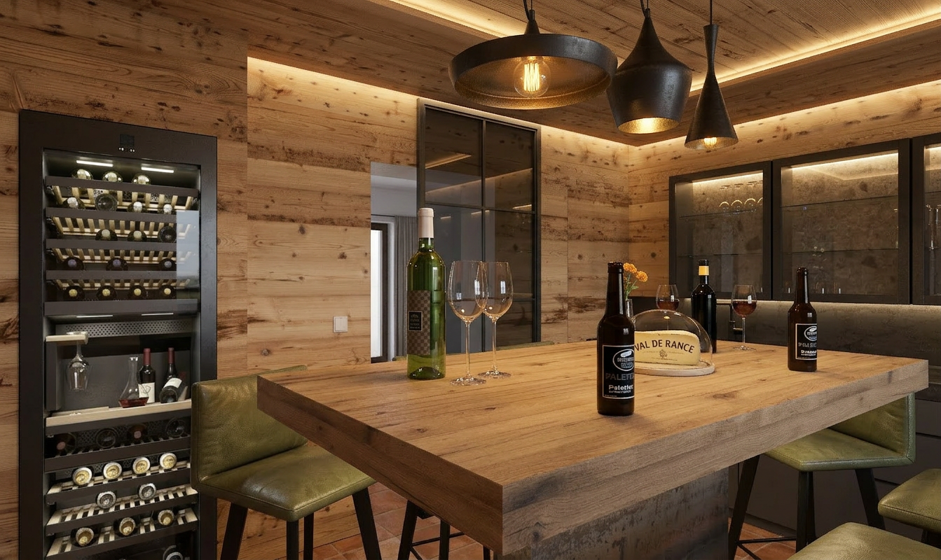 use the provided render strictly as the base image do not change the camera angle composition lighting furniture materials architecture or any other objects in the scene modify only the rabbit located under the cabinet change its fur color to match the rabbit in the reference photo predominantly black fur with a distinct white neck chest area keep the same pose and position but make the rabbit slightly smaller so it appears more proportionally realistic within the cage also adjust the cage interior so there is only a small amount of hay visible inside the hay should look minimal and tidy not piled up do not modify anything else in the image
