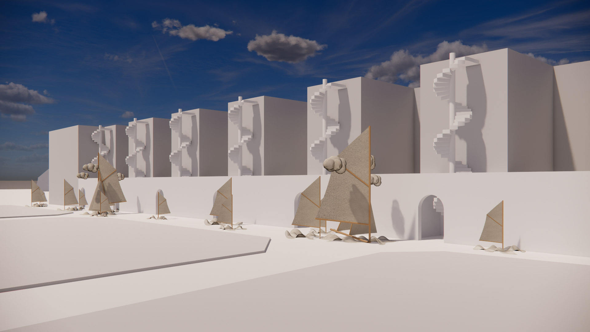 a singapore alleyway with a light and shadow art installation a white fabric scaffolding covers the back wall phinisi sail masts of different heights are placed along the alley way made of white fabrics with upwash lighting each masts base is made up of mesh fabric to look like waves which glow in warm colours a giant sail with fabric clouds overhanging and subtle lightning effects spotlights cast numerous shadows of people against the left walls people fill the lane warm light spotlights cast a warm glow over the entire space
