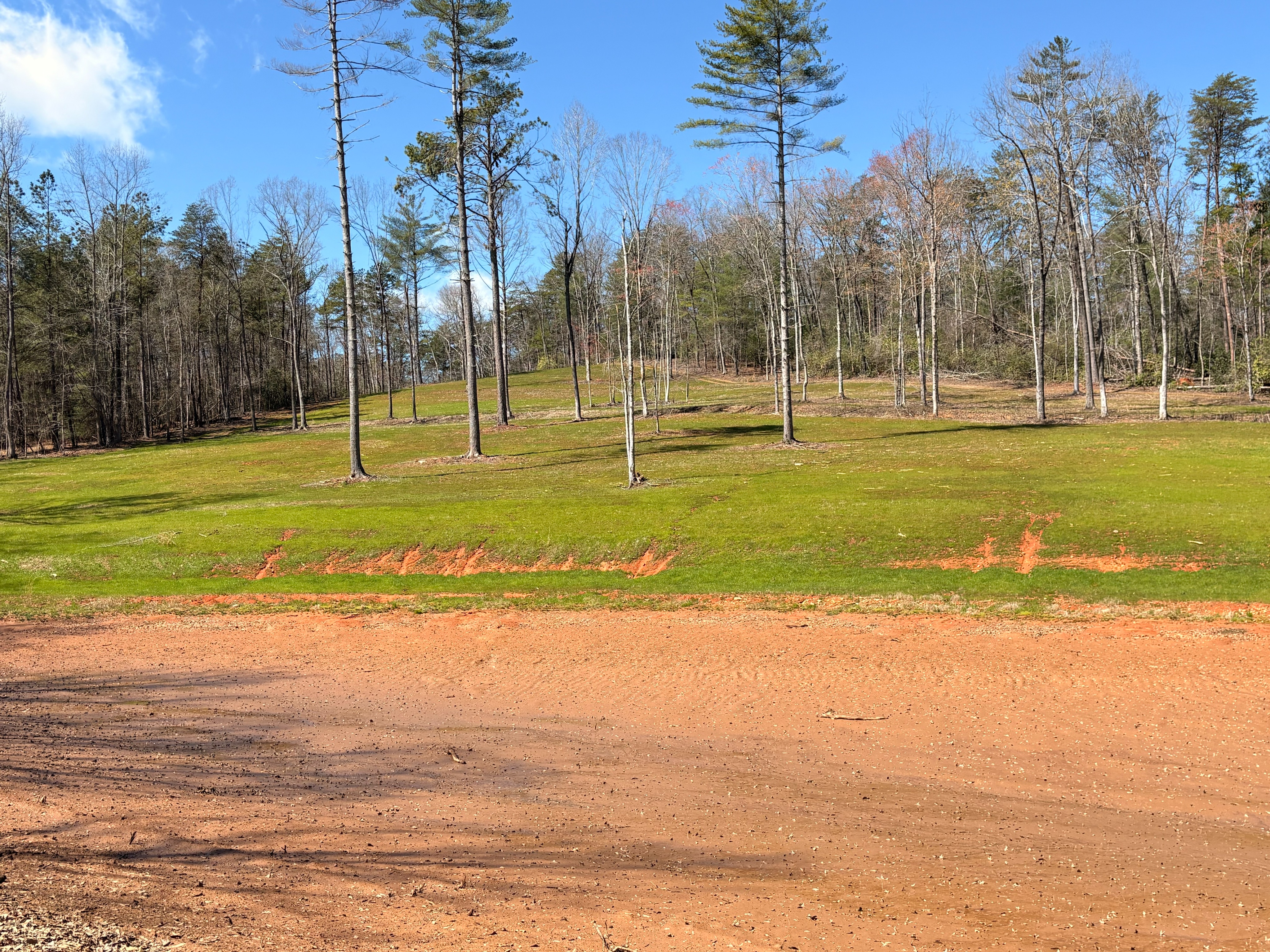 show pond in the foreground show rustic two story lodge on top of the hill with long extensive porch with people sitting on porch and large firepit out front between the pond and the lodge add leaves to all trees