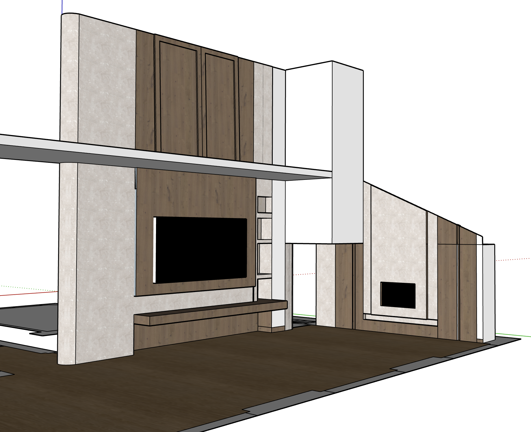 its a two floor living room overlooking tv zone and fireplace maintain the colours and materials light stone is light limestone on the floor is light oak and the tv zone and around fireplace is dark oak all are one piece pieces some visible spaces are white walls maintain the placement create a realistic photo render
