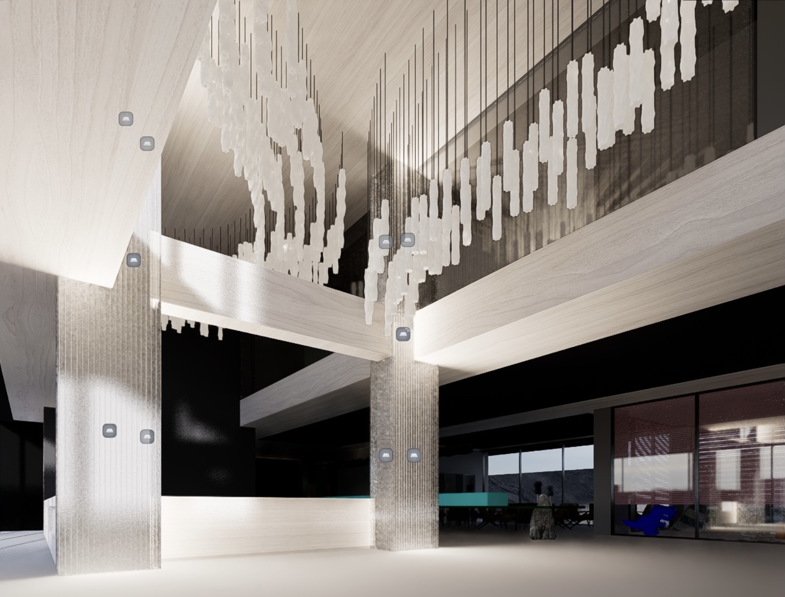 zaha hadid interior shot render a modern architectural interior featuring high ceilings and cascading white light fixtures use light oak wood tones for the ceiling beams and support structures incorporate clear textured glass elements to enhance the modern aesthetic accentuate with a deep charcoal grey for wall accents and a dark subtle black for the background infuse a tranquil sophisticated atmosphere with soft diffused lighting and minimalistic design elements introduce a hint of teal on distant horizontal surfaces to add a pop of color while maintaining the serene ambiance architecture