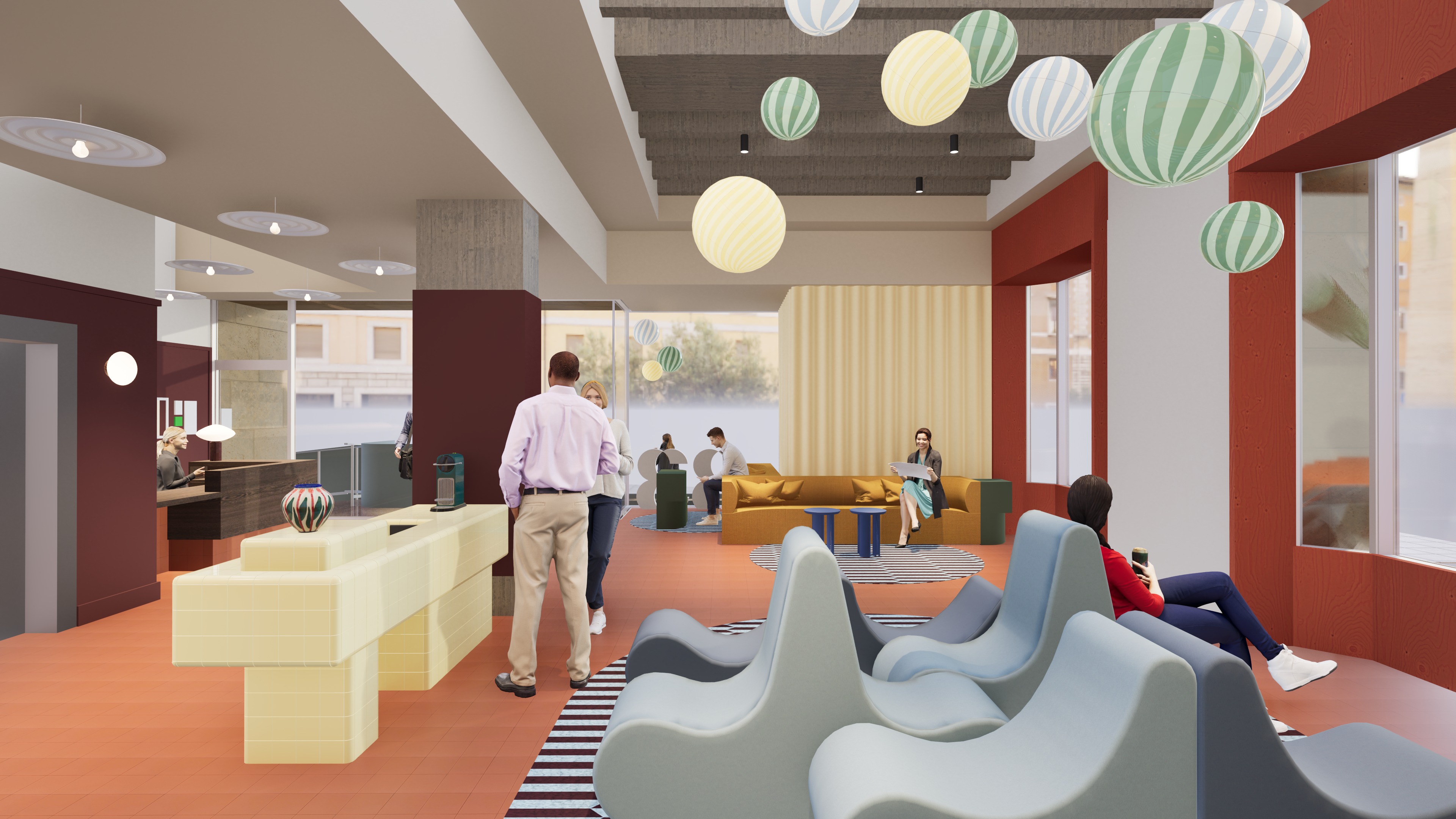maintain all colours and architectural elements terracotta floor tile to be matte with slight sheen patterned rug and sculptural seating to appear soft enhance realism of lighting materials and people daylight entering from left striped pendant glass globe lights should have a soft glow