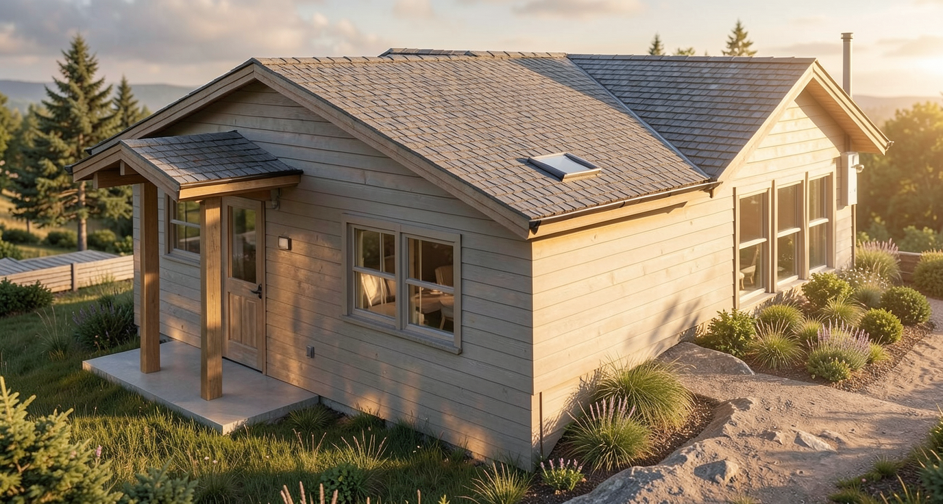 back view of a clean scandinavian barn home architectural exterior home rendered in cinematic golden hour lighting with bits of blue skies and sunlight coming through the clouds barn home in a scandinavian environment with faint streaks of light coming through trees in the surrounding area warm glow and reflections off of the windows blue sky with big billowy clouds warm select grade vertical wood siding green manicured landscape around structure with gardens and patches of grass black standing seam metal roof prominent trees in the background high fidelity photorealistic visualization crisp shadow falloff refined facade geometry soft atmospheric depth premium architectural photography mood ultra clean composition and materials black window trim flat roof photorealistic render small concrete path around the exterior of the cabin hide concrete footings grass in the foreground black window trim around windows
