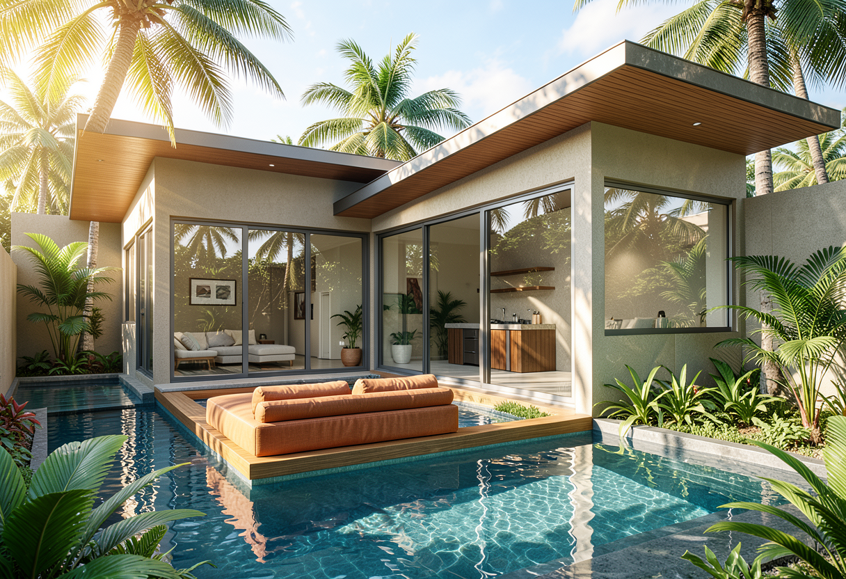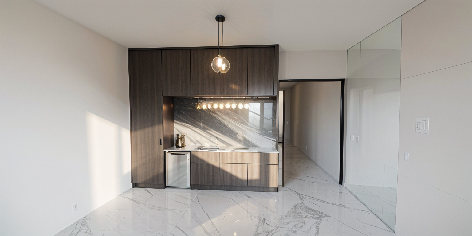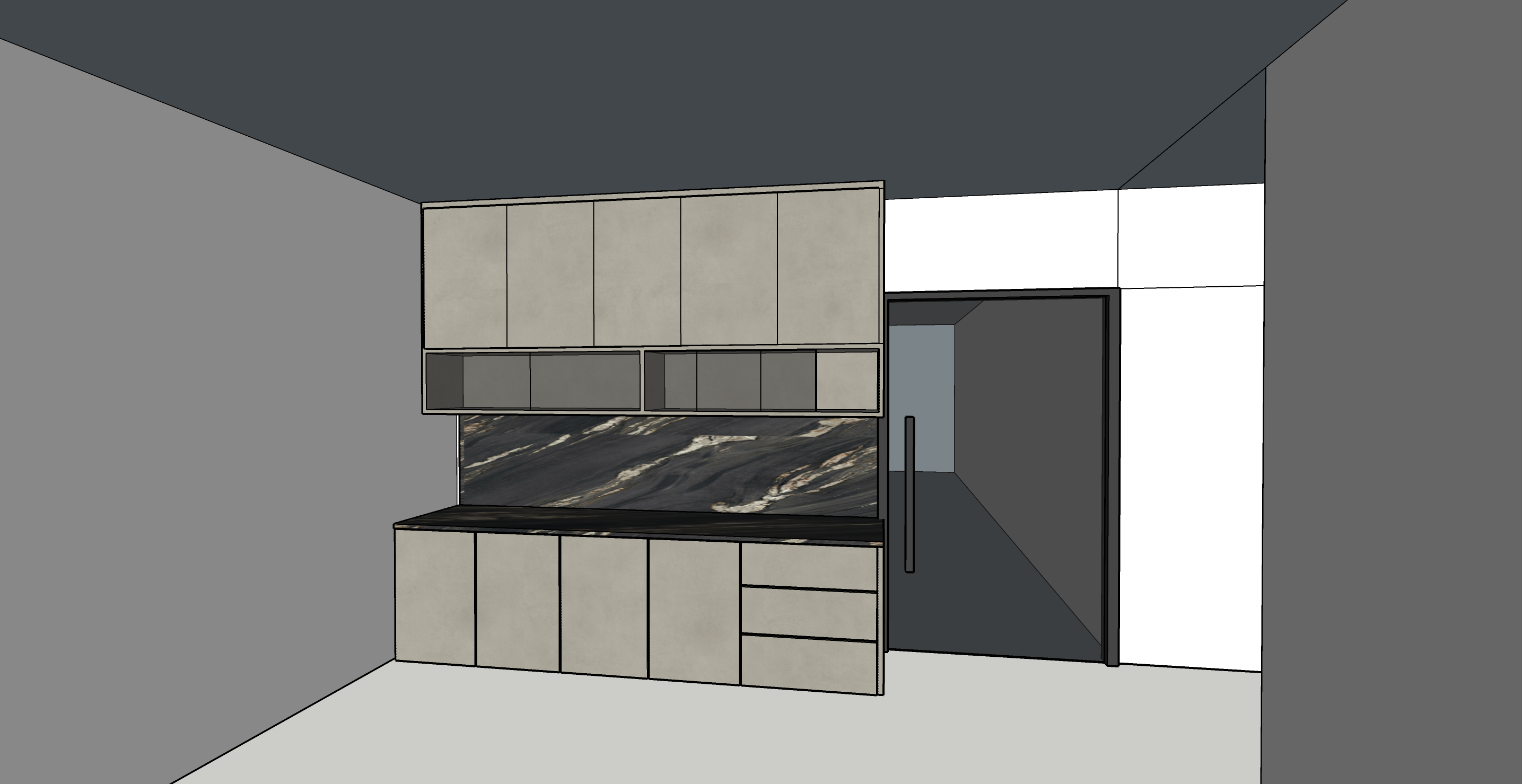 matte microcement laminate for cabinetary reflective polished stone top and backsplash add morning lighting add a hanging light infornt of the pantry flooring to be light grey marble viening large format tiles