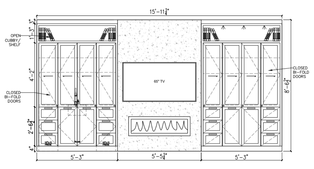 can you take this elevation and make it into a realistic 3d rendering stone cladded fireplace with tv above custom built ins on either side of fireplace in a painted finish this is a transitional living room
