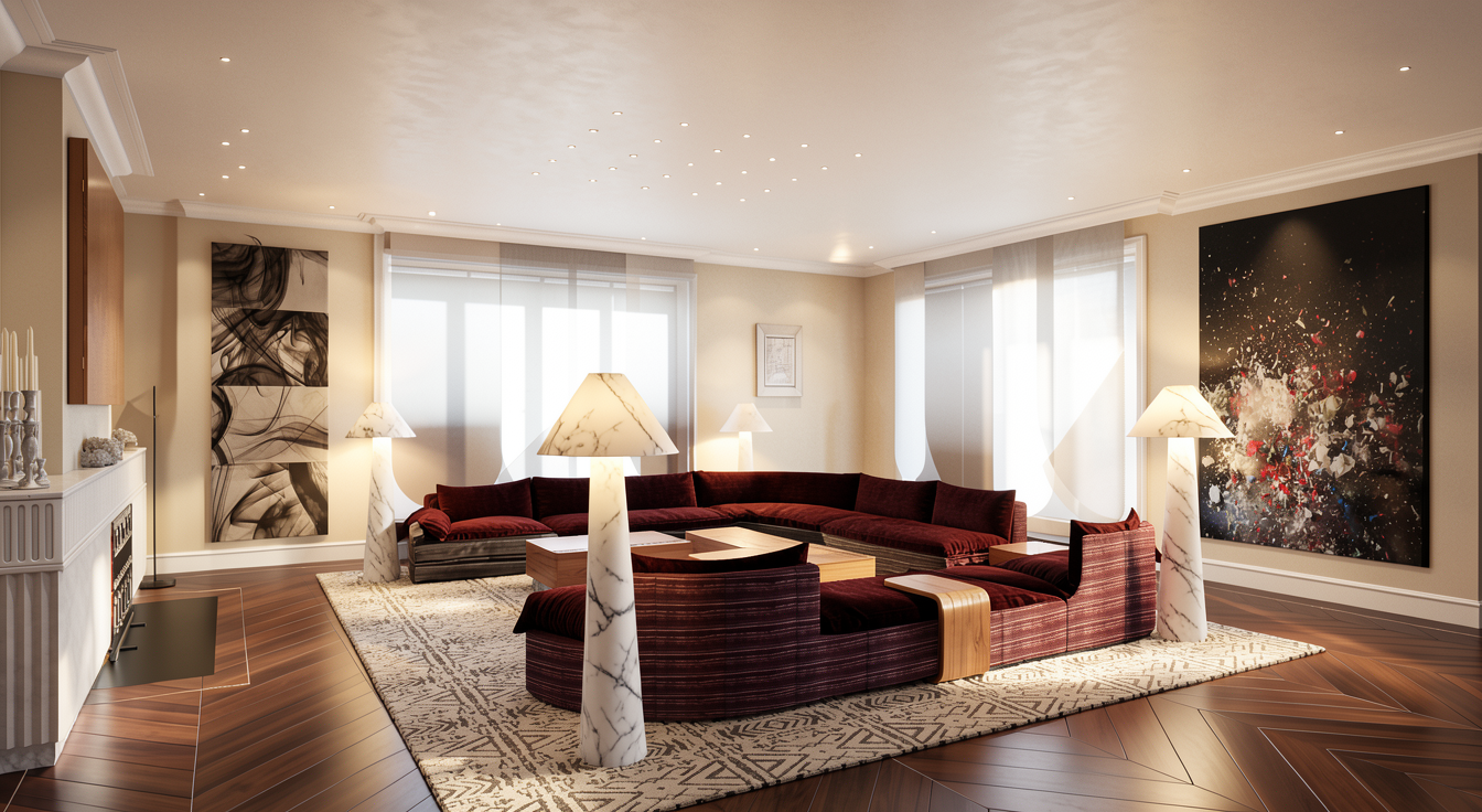 keep all materials as is but make the existing floor lamps realistic and white with tan shades