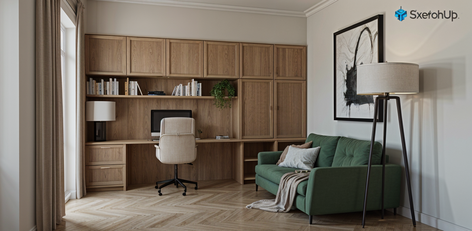 change only the color of the cabinetry and desk to sand beige hex d6c4a8 a soft natural beige with warm undertones smooth matte finish and no visible wood grain or texture all other elements the floor walls sofa cushions curtains lighting d cor artwork and layout must remain exactly as in the original image nothing else may be altered added or removed architecture