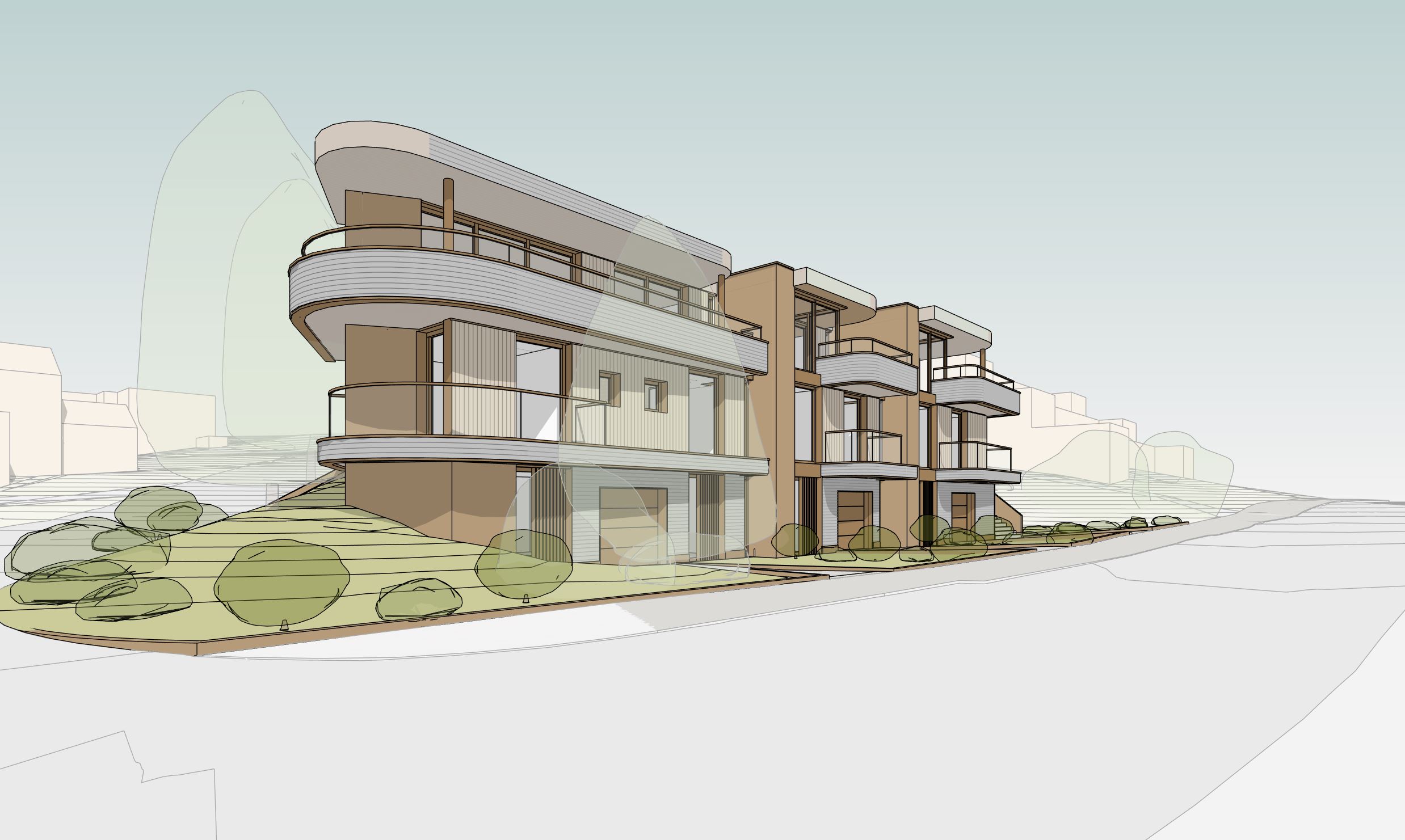 modernist exterior shot render a modern architectural building with smooth rounded balconies using a color palette of whites and soft grays for a sleek contemporary look the main structure should be warm sand and beige while the glass features gently reflect the ambient light in subtle shades of blue surround the building with lush green shrubbery and a well manicured lawn using varying shades of green the atmosphere should be serene and welcoming under a clear pale blue sky with soft natural lighting and gentle shadows for depth and realism architecture