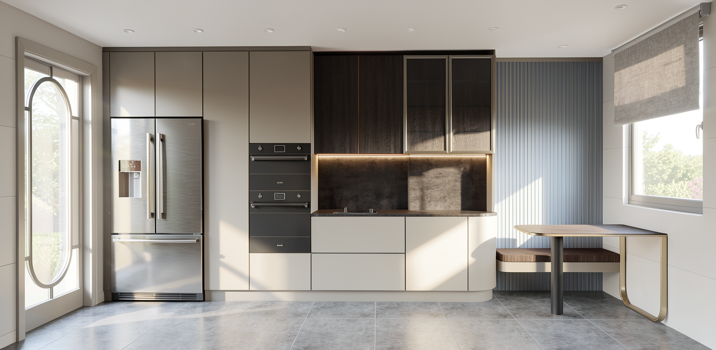 hyper realistic architectural photography high end interior design soft natural sunlight streaming through windows long soft shadows subtle ambient artificial lighting dimmable warm led accents realistic textures 8k resolution highly detailed shot on phase one xf global illumination raytraced reflections clean minimalist aesthetic lock all previous settings subject remove the sunlight and make the artificial lighting more prominent uplighters also emerge from the coffee cups on the back wall shining upwards
