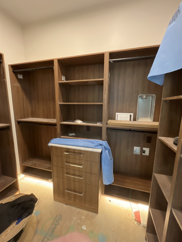 stage this image for a closet with hanging clothes on the closet rods and folded clothes on the shelves remove all of the blue blankets and add a tile floor