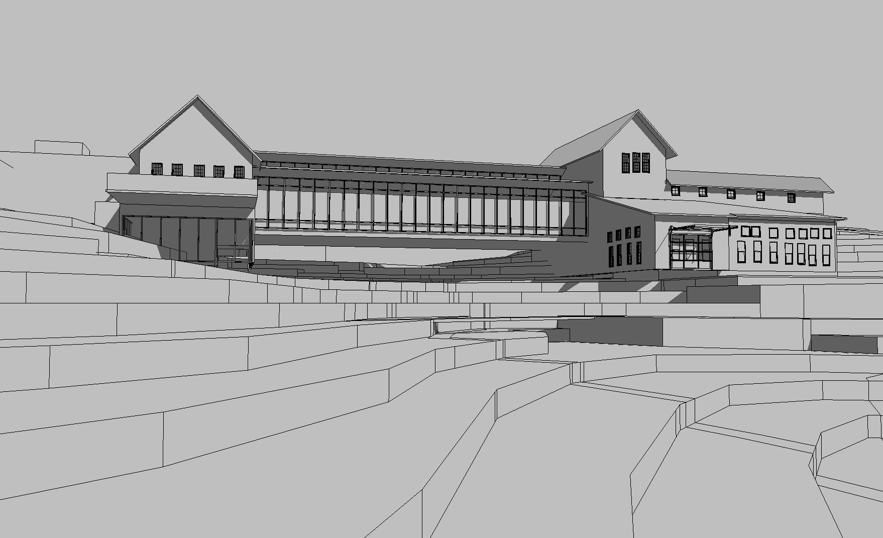 industrial building design field stone vertical shiplap bridge between 2 structures stone base building set in a hill