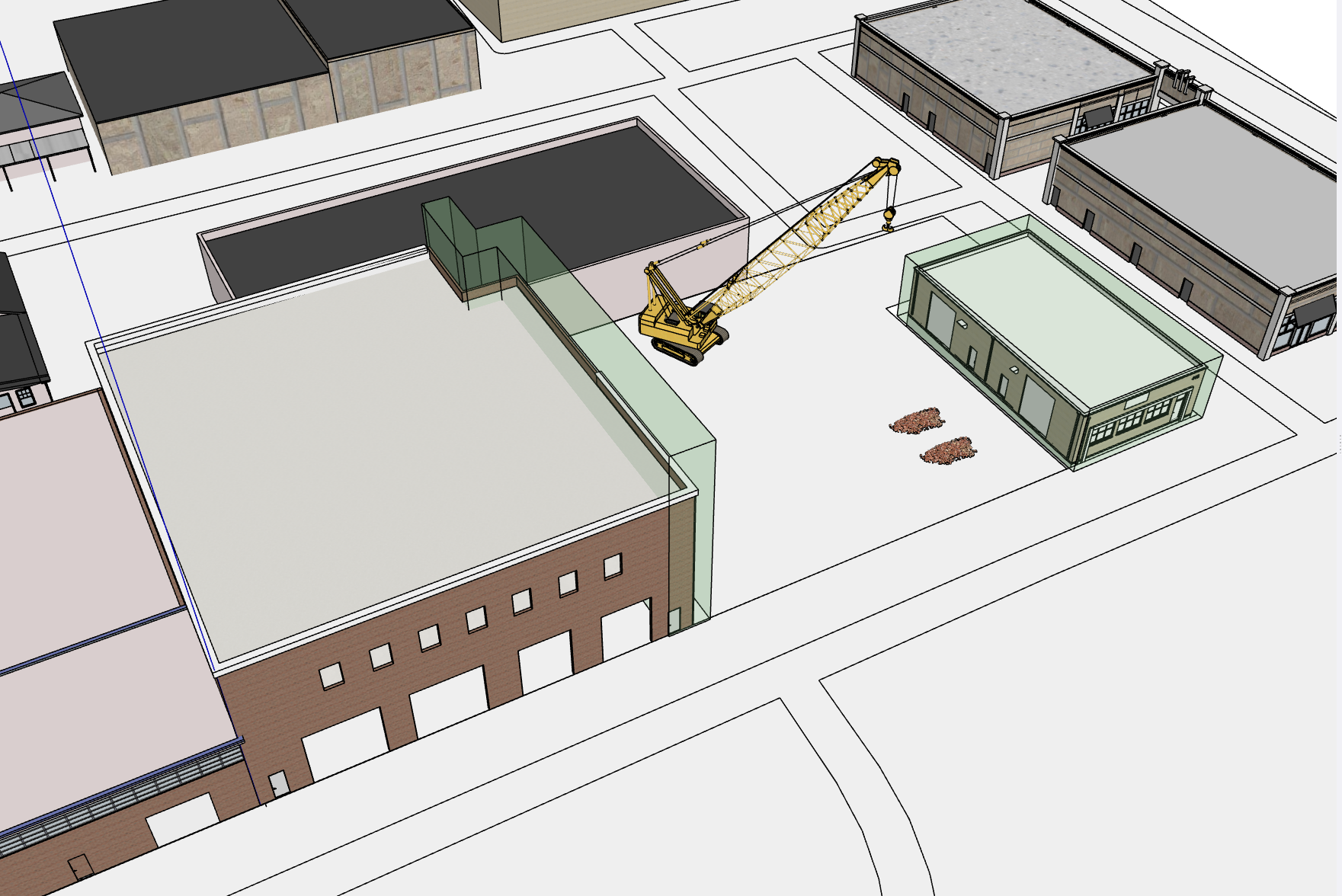 maintain the exact camera geometry and drawing style do not alter remove smudge or distort the green translucent massing volumes they are diagram overlays and must remain crisp intact and clearly readable add subtle construction site enhancements light ground dust near the demolition zone small atmospheric haze shadows under equipment and workers and slightly sharpened brick steel piles dust smoke must remain low and behind the green box do not overlay or obscure it keep shadows soft and architectural not photorealistic preserve all building forms and the clarity of the green massing outline